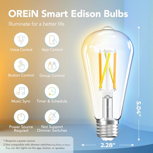 OREiN Smart Edison Light Bulbs, 2.4 Ghz Wi-Fi ST19(58) Vintage Light Bulbs E26, 800LM Dimmable via app, 2700-6500K Tunable, Smart LED Filament Bulb Works with Alexa/Google Home, 60W Equivalent 4Pack
