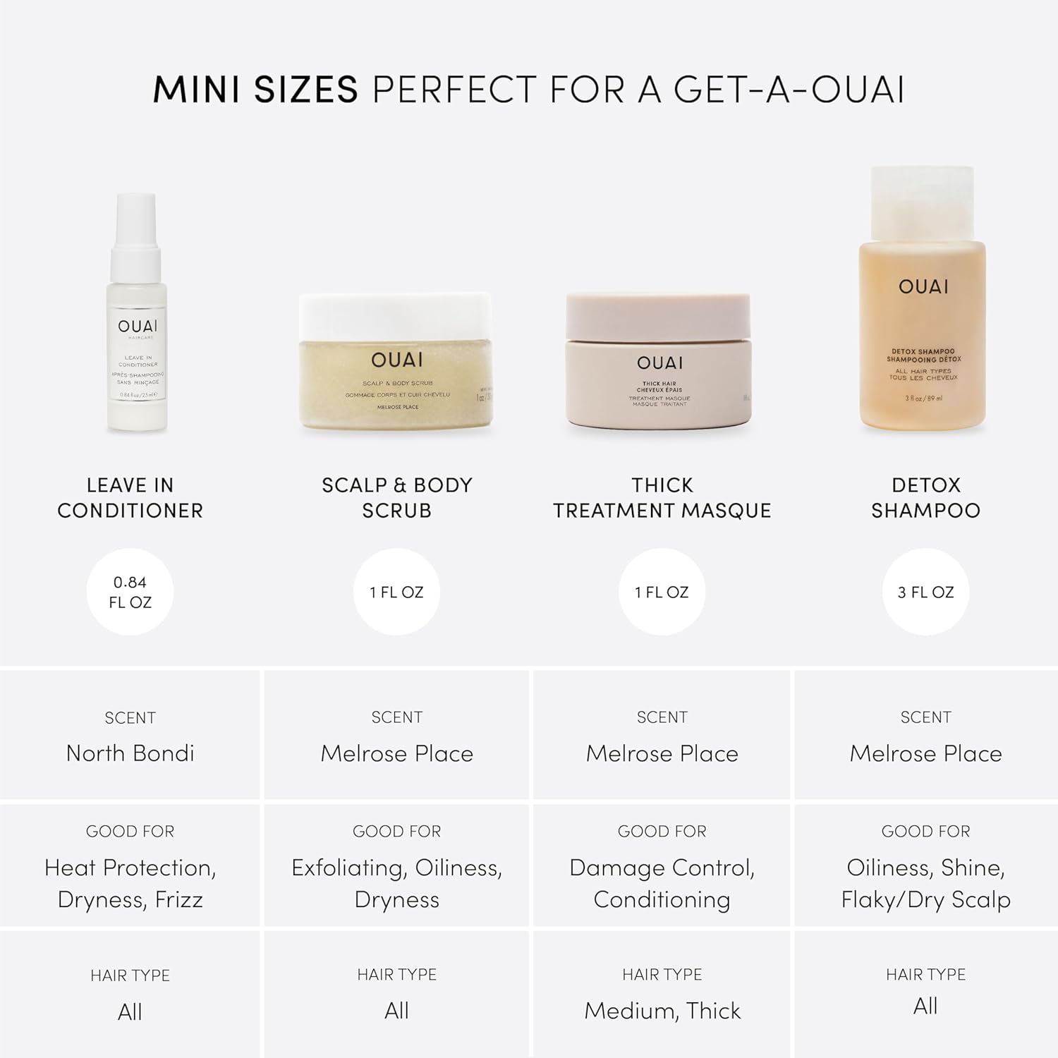 OUAI Travel Kit – Includes Travel Size Leave In Conditioner, Detox Shampoo, Thick Hair Mask, Scalp & Body Scrub (4 Count)