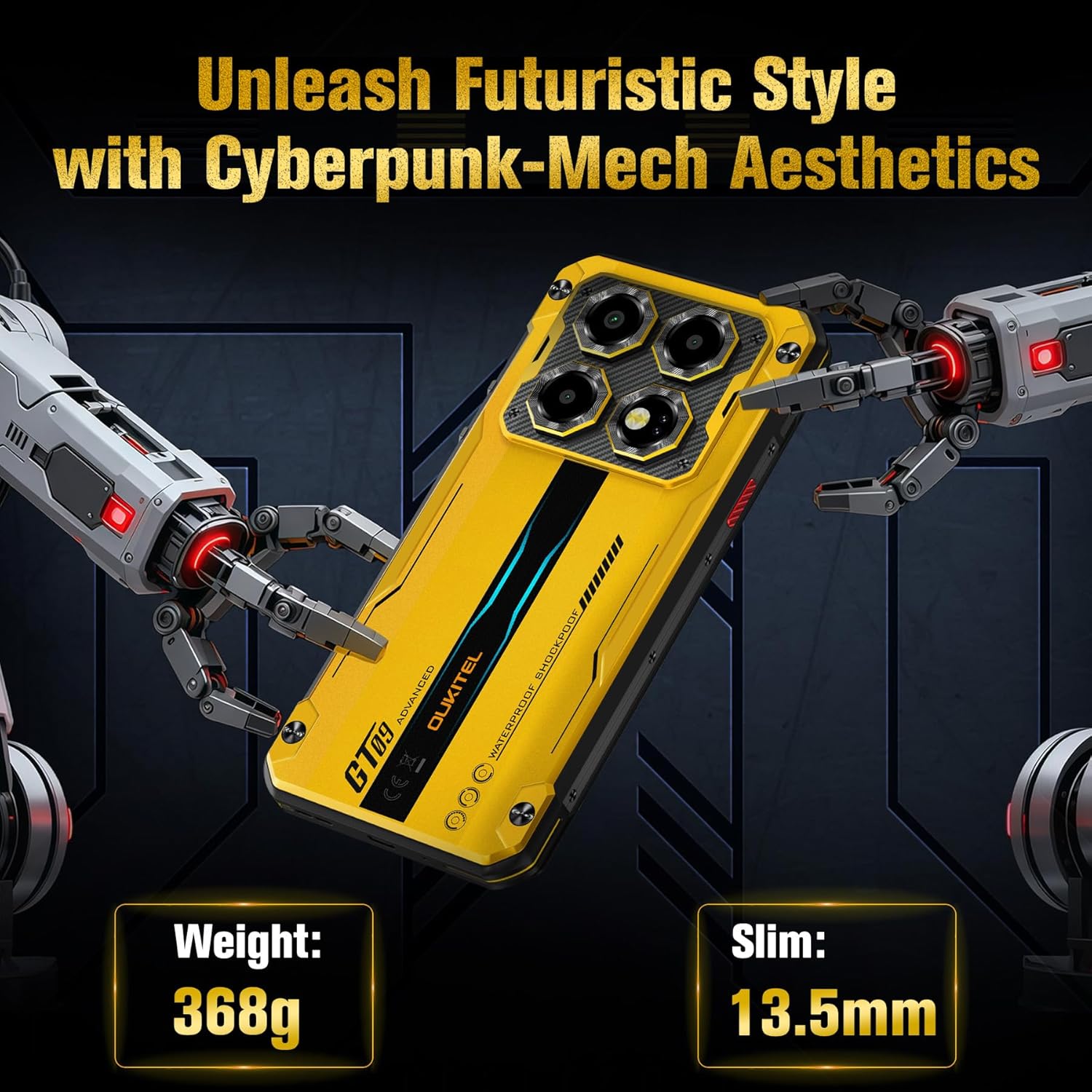 IP68/IP69K & MIL-STD-810H: The OUKITEL WP60 rugged mobile phone is certified IP68/IP69K for dust and water resistance, and MIL-STD-810H military-grade shockproof standards. The unlocked cell phone offers comprehensive protection against dust, sand, and contaminants, ensuring reliable performance during hiking, outdoor work, or extreme weather conditions.This smart phones makes a statement with the premium cyberpunk-mech design. Crafted with dual-color injection molding and an aluminum-titanium alloy body,it combines exceptional durabilty with asecure,ergonomic grip. Every angle exudes bold, modern style,while its striking aesthetics ensure all eyes are on you wherever you go.