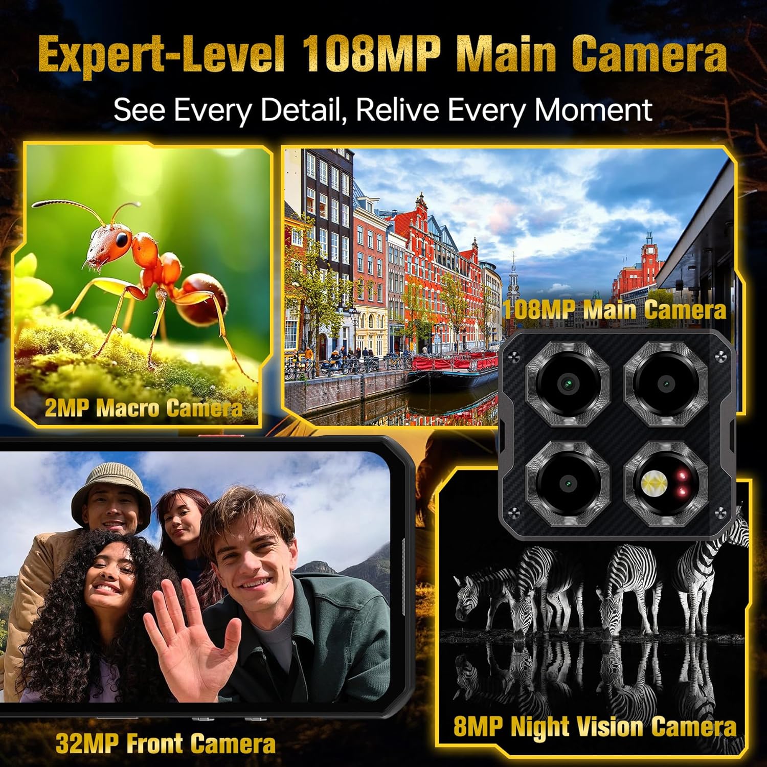 108MP + 32MP +8MP + 2MP Camera: The OUKITEL WP60 smartphone features a 108MP main camera, capable of capturing sharp photos and videos in any scenario. An 8MP night vision camera ensures clear imaging in complete darkness, with fast autofocus for quick shots. While the front boasts a 32MP camera. Whether for daily selfies, video calls, or low-light photography, it delivers sharp, vivid quality. The 2MP macro lens captures sharp close-ups of tiny objects, revealing details invisible to the naked eye.The smartphone supports multiple shooting modes including Panorama, HDR, Beauty, AI, and Pro, effortlessly handling diverse scenes and lighting conditions to capture every stunning moment.