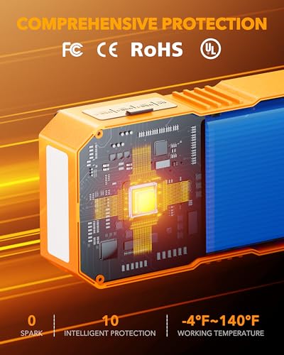 【10-Way Protection & Certified Safety】The OXILAM car battery jump starter features an integrated battery and intelligent clamps design, equipped with 10 intelligent safety protections against short circuits, reverse polarity, sparks, and more. It is rigorously tested and certified by UL, FCC, and CE, protecting both the unit and your vehicle’s battery from damage due to overheating or incorrect connections