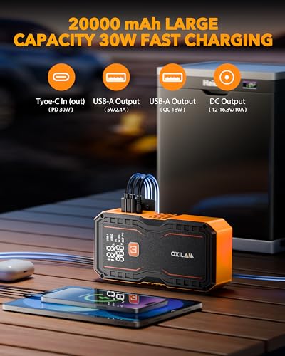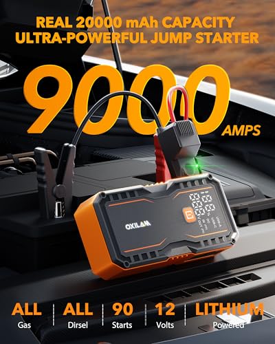 OXILAM 20000mAh Jump Starter for All Gas & Diesel Engines, 9000A Battery Jumper Starter Portable, 12V Jump Box with Quick Charger, Extended Jumper Cable, LED Display, USB, DC, Type C Port & LED Light
