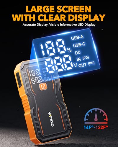 【Smart Display & Rugged, Portable Design】Engineered for ultimate ease of use, Car jump starter features a smart voltage analyzer for guaranteed hassle-free starts—no external booster required—and an LCD screen that clearly displays real-time status. Built with a waterproof, sturdy shell, a protective cover, and non-slip sides for a secure grip, its ultra-compact, lightweight design stores easily in any glove box or backpack, ready for any emergency