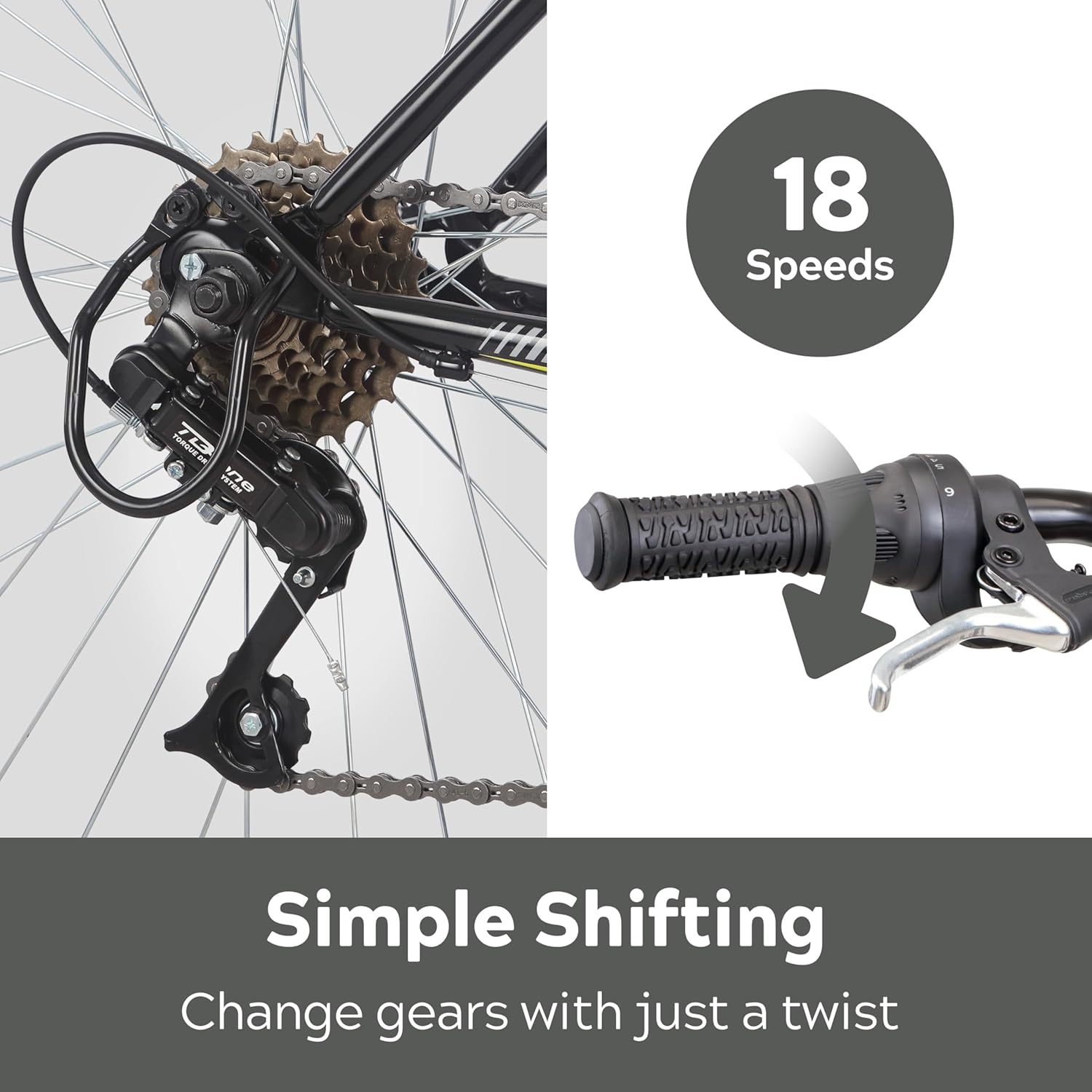 GEARED FOR ADVENTURE: Ride off the beaten path with ease thanks to the 18-speed drivetrain and easy-to-use twist shifters. Whether cruising or climbing, this womens and mens mountain bike will help you get into gear.