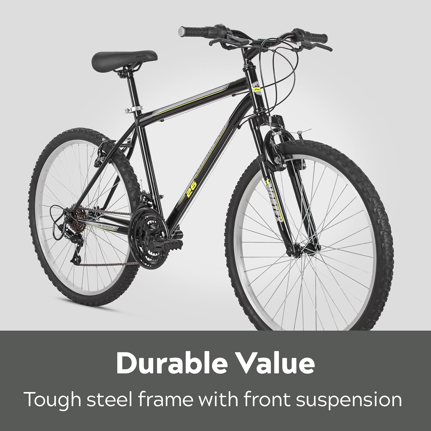 SMOOTH OUT THE BUMPS: A front suspension fork with 50 mm of travel helps absorb shocks from bumps, dips, and uneven ground – so you can ride longer with more comfort. The durable steel frame is built to handle rough rides and rocky terrain.