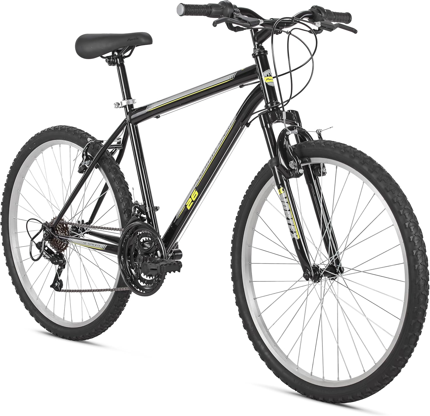 Tackle new terrain with the Pacific Mountain Sport, a rugged and reliable mountain bike built for everyday adventure. Designed for riders who want to explore beyond the pavement, this bike features a strong steel mountain frame and 26-inch wheels, making it a great fit for riders 5’4″ – 6’1″ tall. Whether you’re cruising the neighborhood or tackling light off-road trails, the front suspension fork with 50 mm of travel helps absorb bumps for a more comfortable ride. Twist shifters and an 18-speed drivetrain make it easy to switch gears and adapt to changes in terrain, while front and rear linear-pull brakes provide consistent stopping power. Knobby tires offer extra grip and control on dirt paths, gravel, and uneven surfaces. Built with durability and value in mind, the Pacific Mountain Sport is a solid choice for teens and adults who want to enjoy the freedom of the outdoors without breaking the bank.