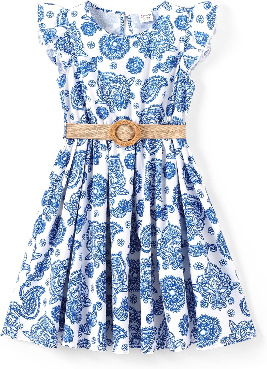 PATPAT Little Big Girls Dress Vintage Boho Floral Ruffle Short Sleeve Casual Swing Dress with Braided Belt