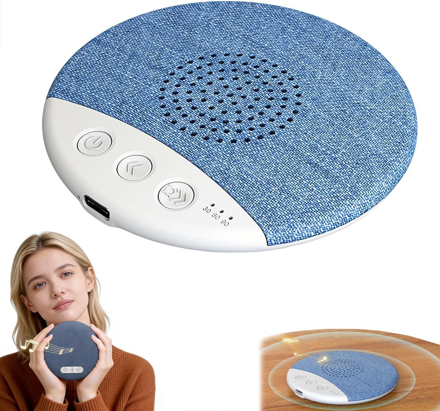 3. Premium Compact Design: Featuring a smooth ABS casing wrapped in acoustic fabric mesh, this sleep speaker combines durability with comfort. Measuring just 9.6cm diameter and 1.1cm height (3.78″×0.43″), its sleek blue design complements any bedroom decor.