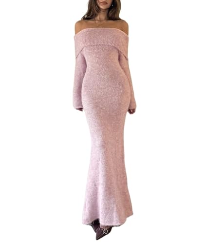 PJYLLND Sleeve Knit Sweater Long Dress Round Neck Women’s Fall Winter Fashion Casual Dress Pink
