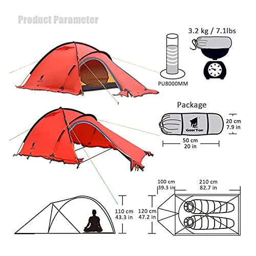 *【2 Person Tent 4 Season】Height – 39.4 in; Floor – (83+39) x 47 in; Enough room for 2 adults. and will keep you warm and dry even in the strongest wind heavy rain or the coldest snow perfect for camping climbing hiking in winter spring summer autumn