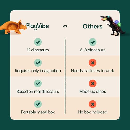 Engage with Dinosaur Adventures: Immerse children in prehistoric excitement with PLAYVIBE Dinosaur Toys for Kids, featuring 12 detailed dinosaur figures and a stylish metal storage box. Ideal as dinosaur toys for kids 3-5, these figures spark creativity and exploration