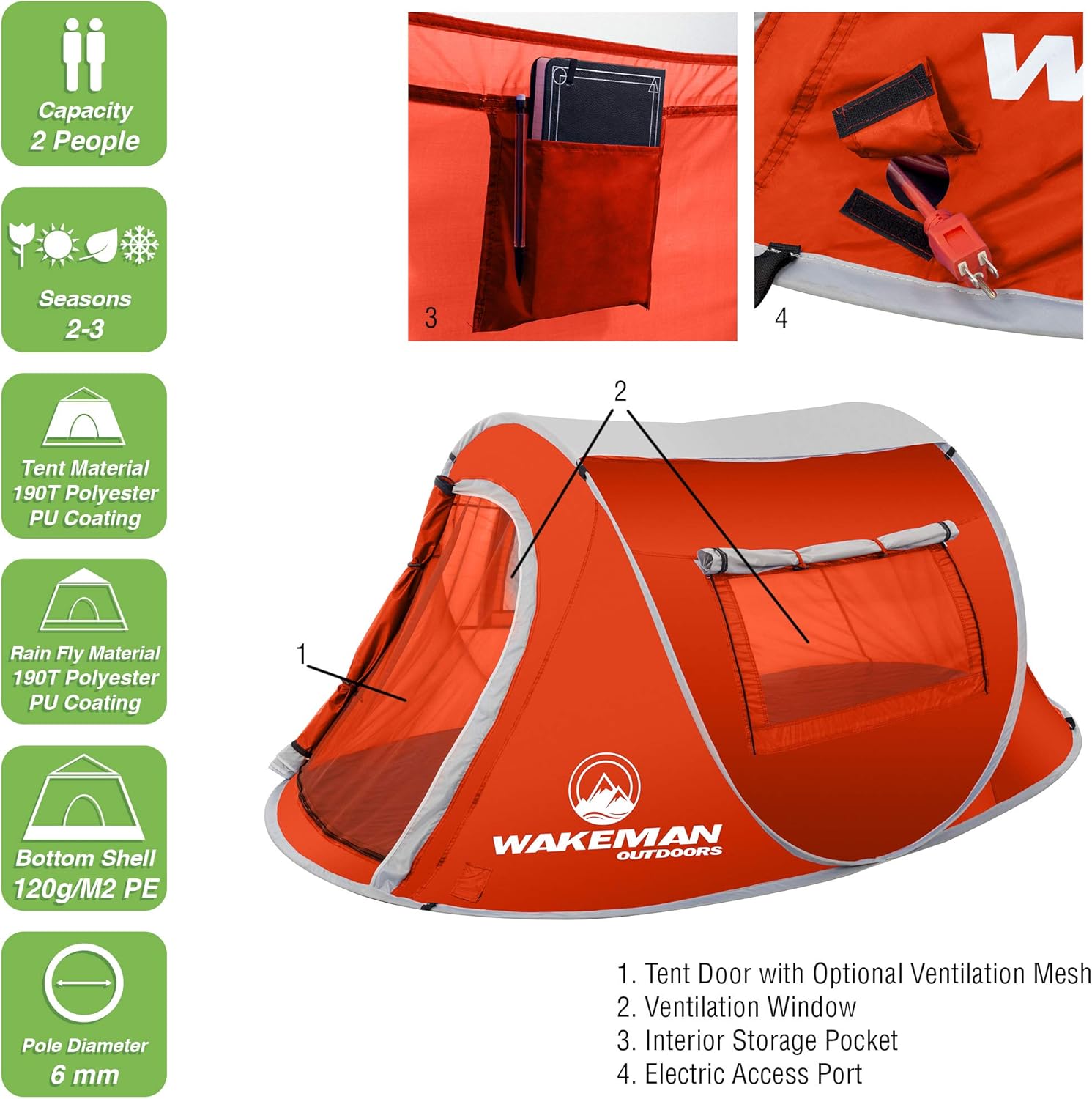 Make your camping adventure a pleasant and memorable one by bringing the Wakeman Outdoors Sunchaser 2-Person Pop Up Tent . This tent boasts an 8′ by 4.9 foot base and a 3.3 foot center height for extra space and an interior storage pocket for your phone, flashlight, or other small camping gear. With the rain resistant coating and taped seams, this tent is a great 3-season option to instantly set up, take down, and keep your time spent experiencing the outdoors.