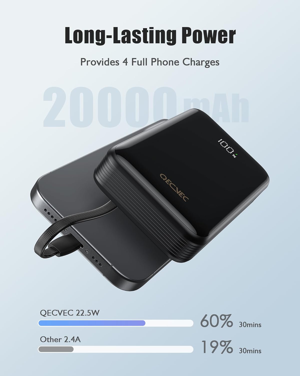 【Portable charger with built-in cables】Slim portable charger 20000mAh built-in 2 output cables, it can charge almost for all types of port devices. Such as for iPhone, iPad, for Samsung, for other USB C port phones, tablets, and also for micro devices. All in one portable charger, you would not need to carry different cables or adapters any more.