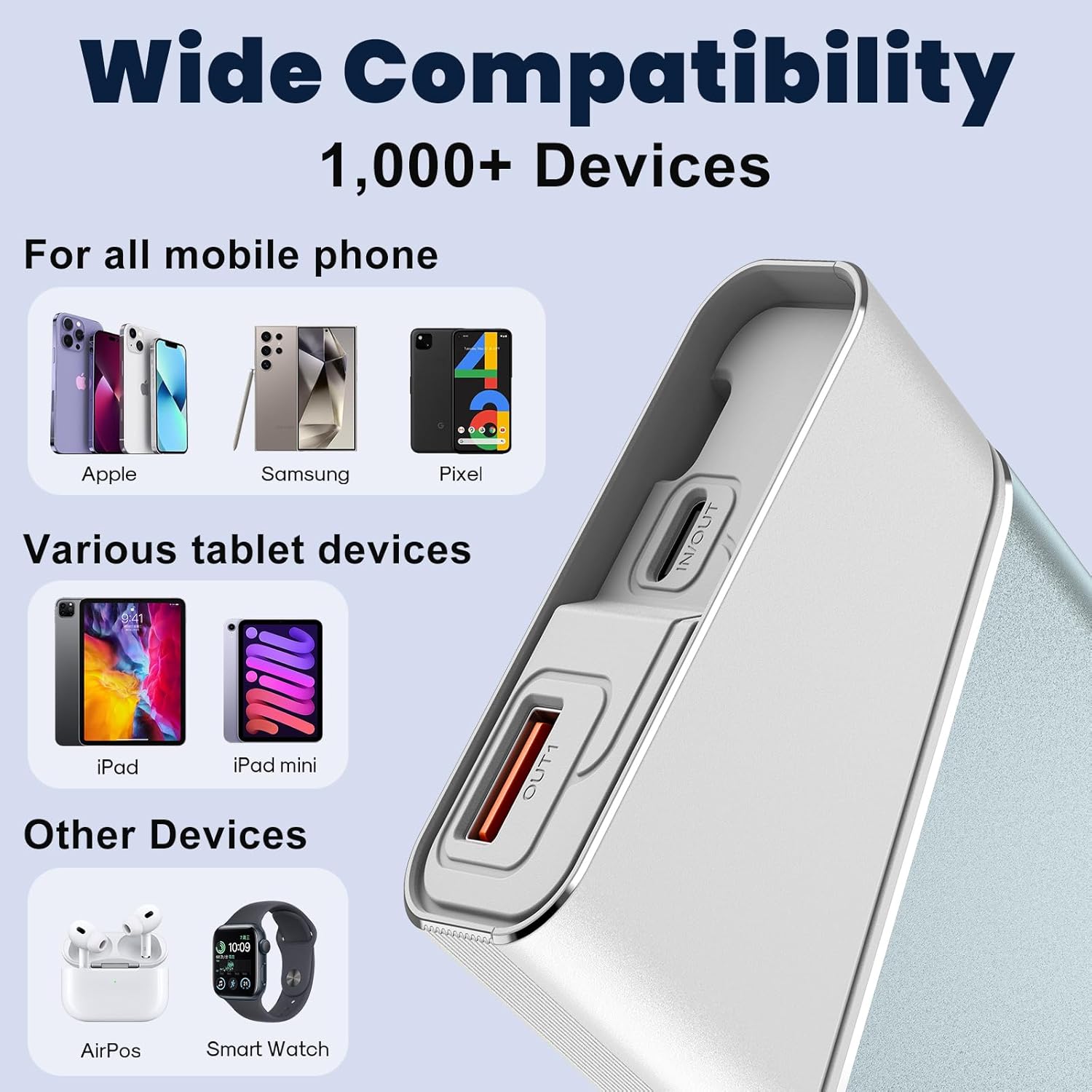 22.5W Super Speed Charging : Experience rapid charging with our upgraded battery pack, featuring both PD 22.5W output and input. In just 30 minutes, it charges for your iPhone 17/16 to 65%—three times faster than traditional 2.1A power banks. With dual ports (USB-C & USB-A), this 20000mAh portable power bank keeps your devices fully charged throughout the day, allowing for simultaneous charging of two devices.