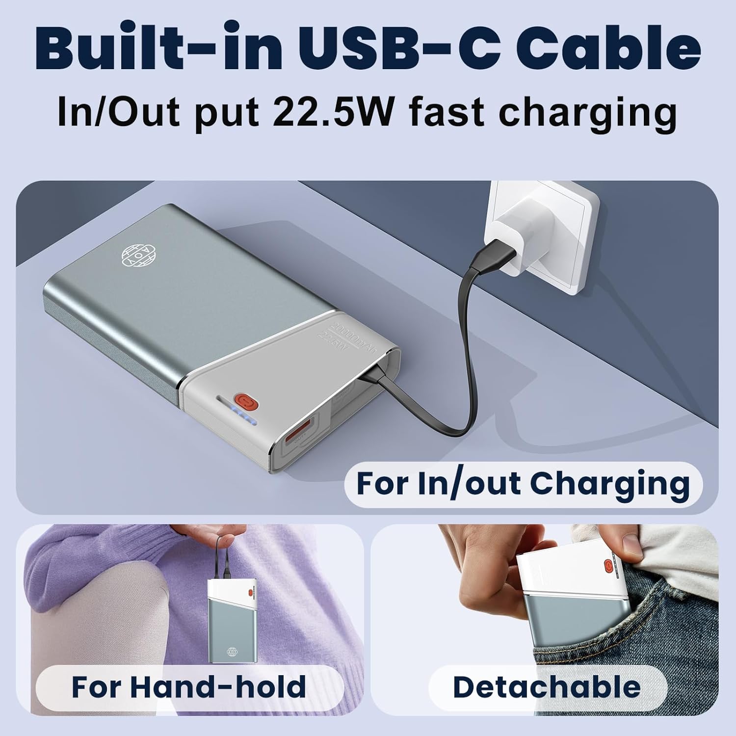 Specification: Portable Charger Power Bank, 20000mAh 22.5W PD Super Fast Charging Powerbank with Built-in USB C in&Out Cable, External Phone Battery Pack for iPhone 17/16/15 iPad Samsung S24 Android etc