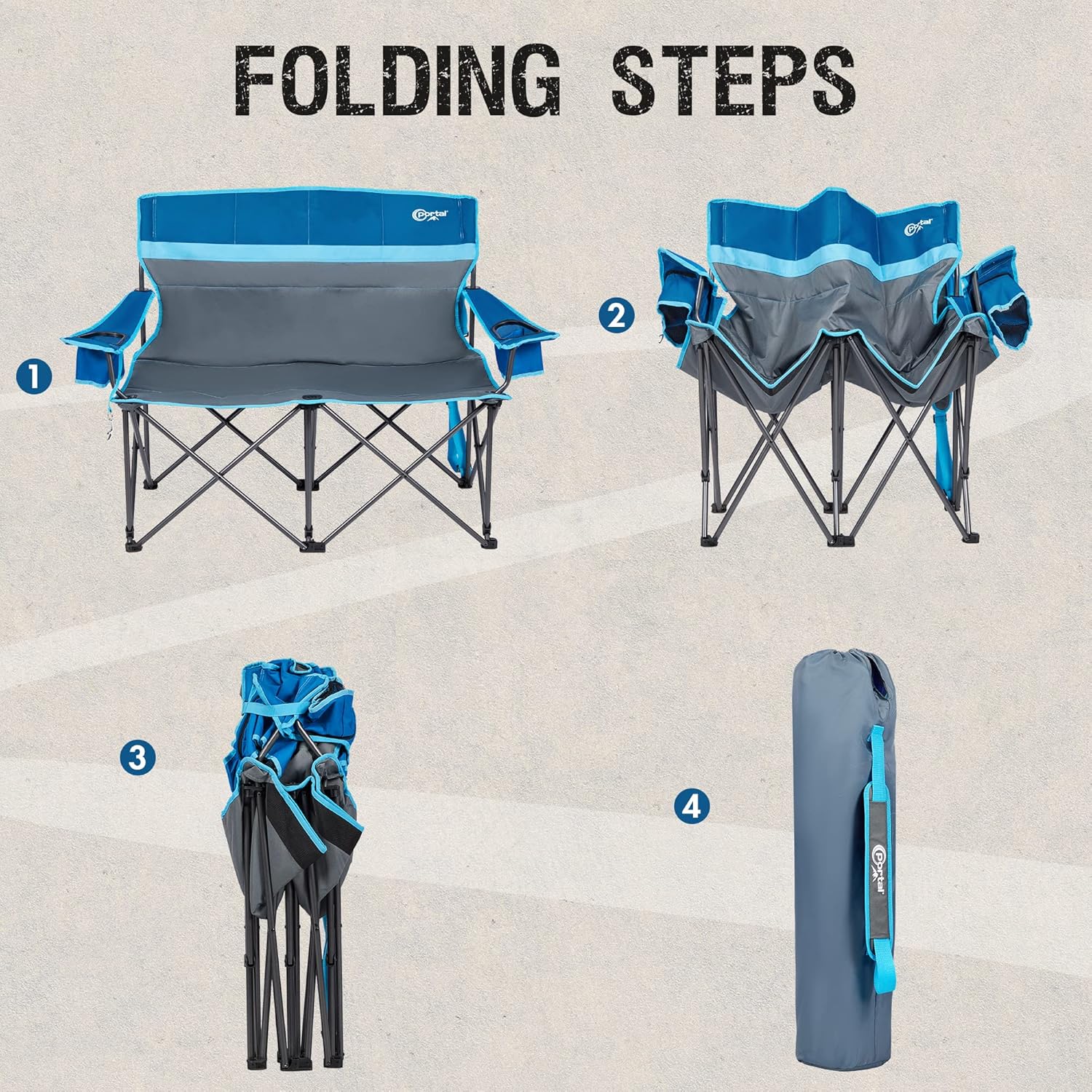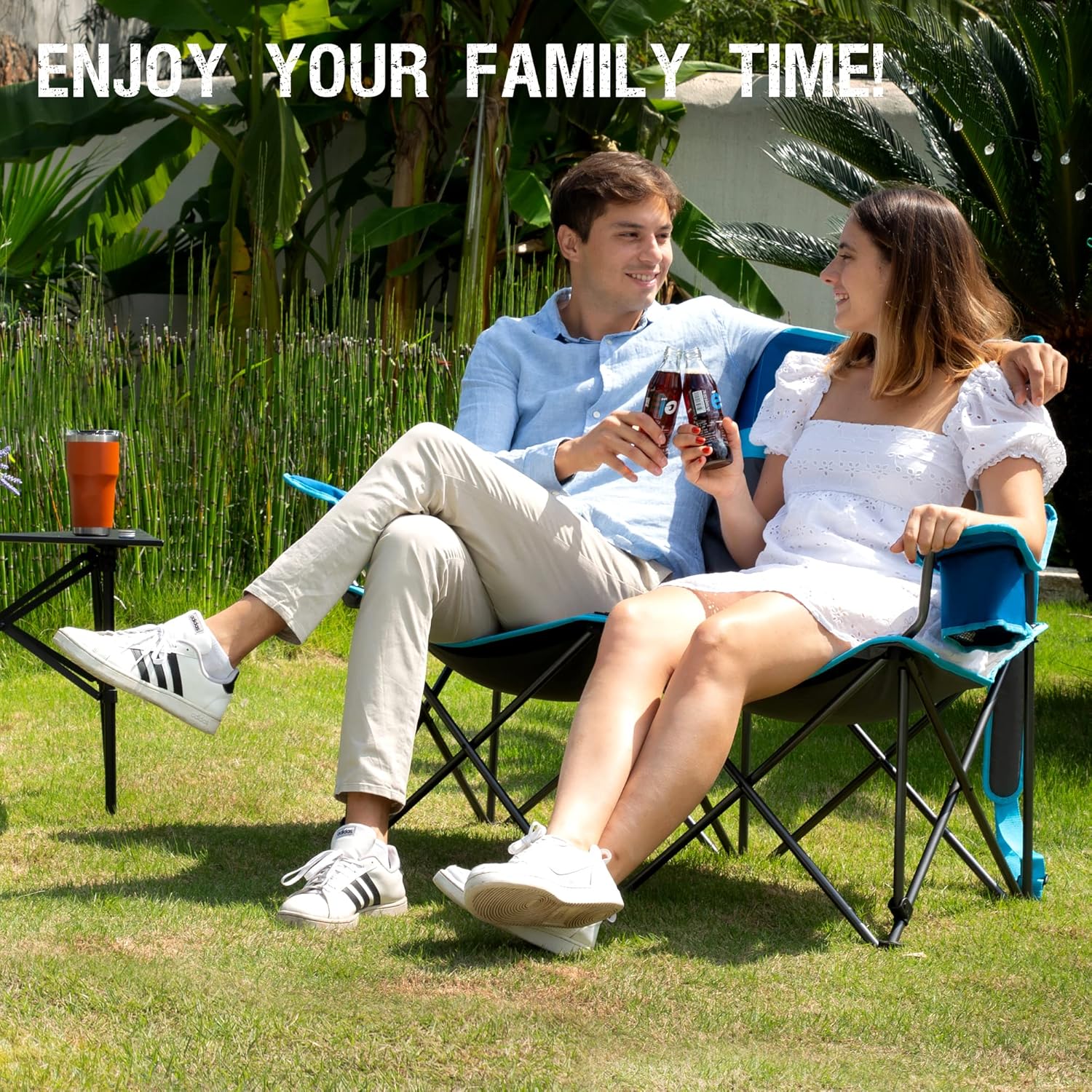 Portal 2 Person Camping Loveseat Folding Double Duo Camp Chair for Adults High Back Outdoor, Support 500 lbs, Blue