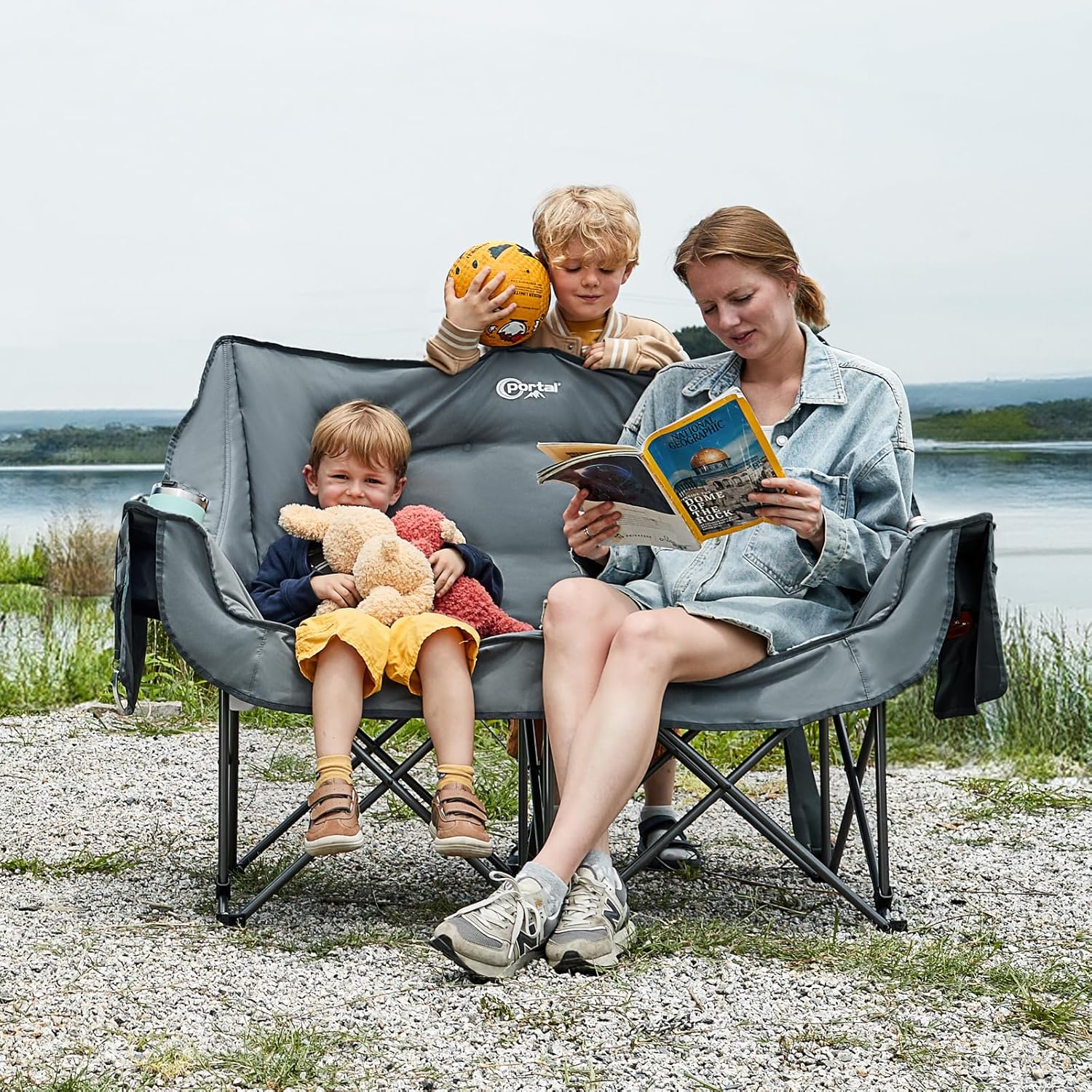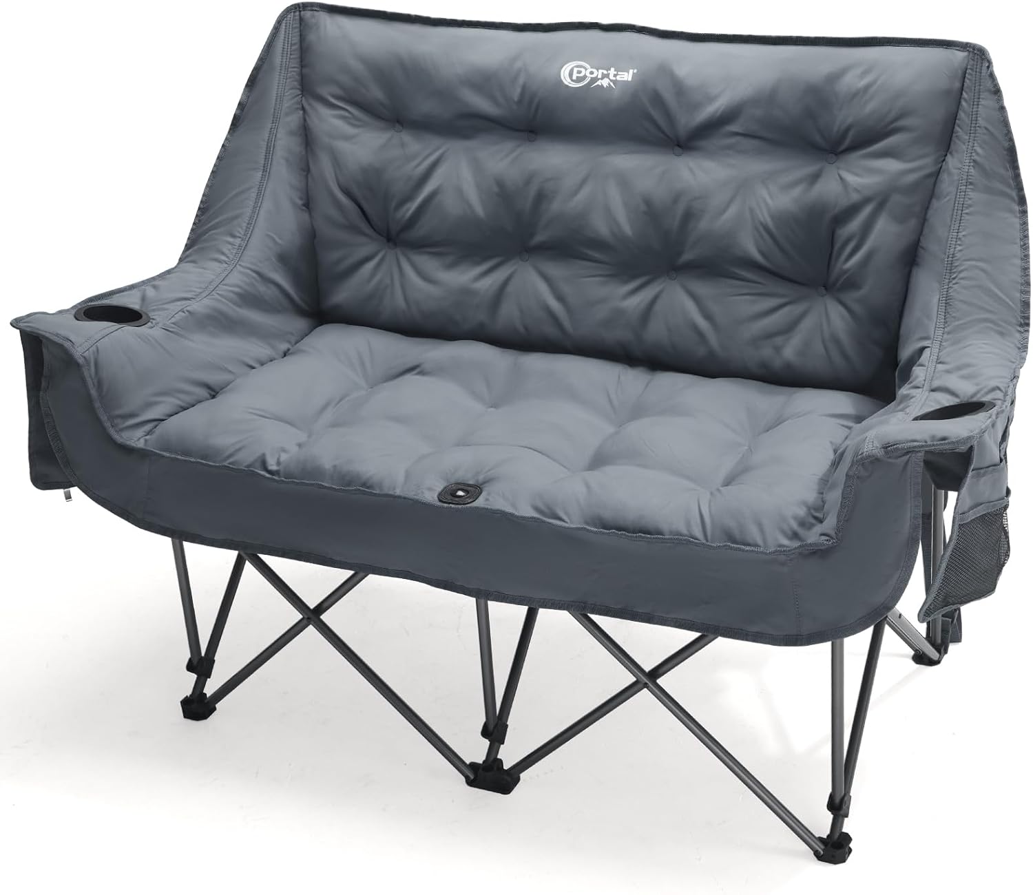 Portal Double Camping Chair, 2 Person Folding Loveseat for Adults, Padded Cushion Camp Lawn Love Seat with Side Pocket Portable Couch, Two Person Heavy Duty Wide Chairs with Cup Holder, 600 lbs