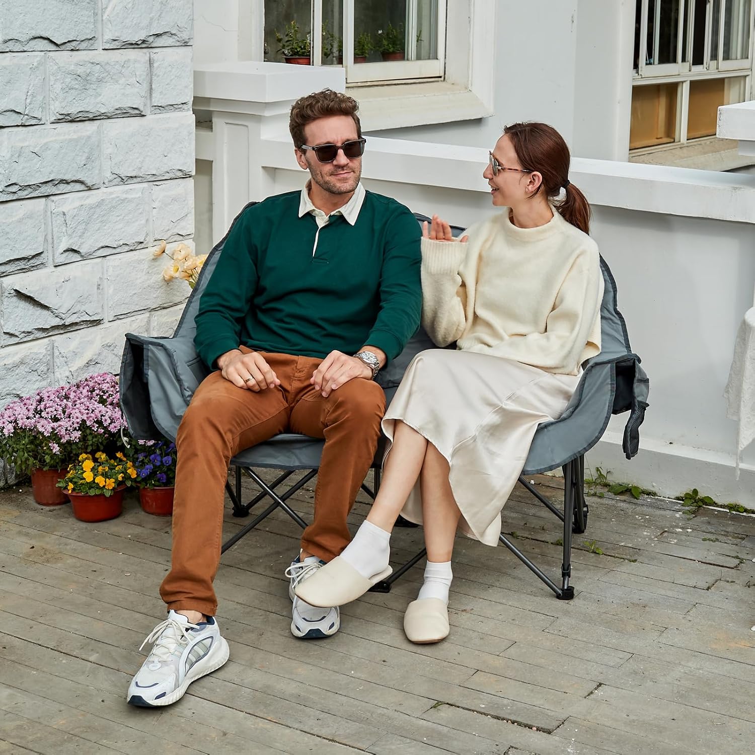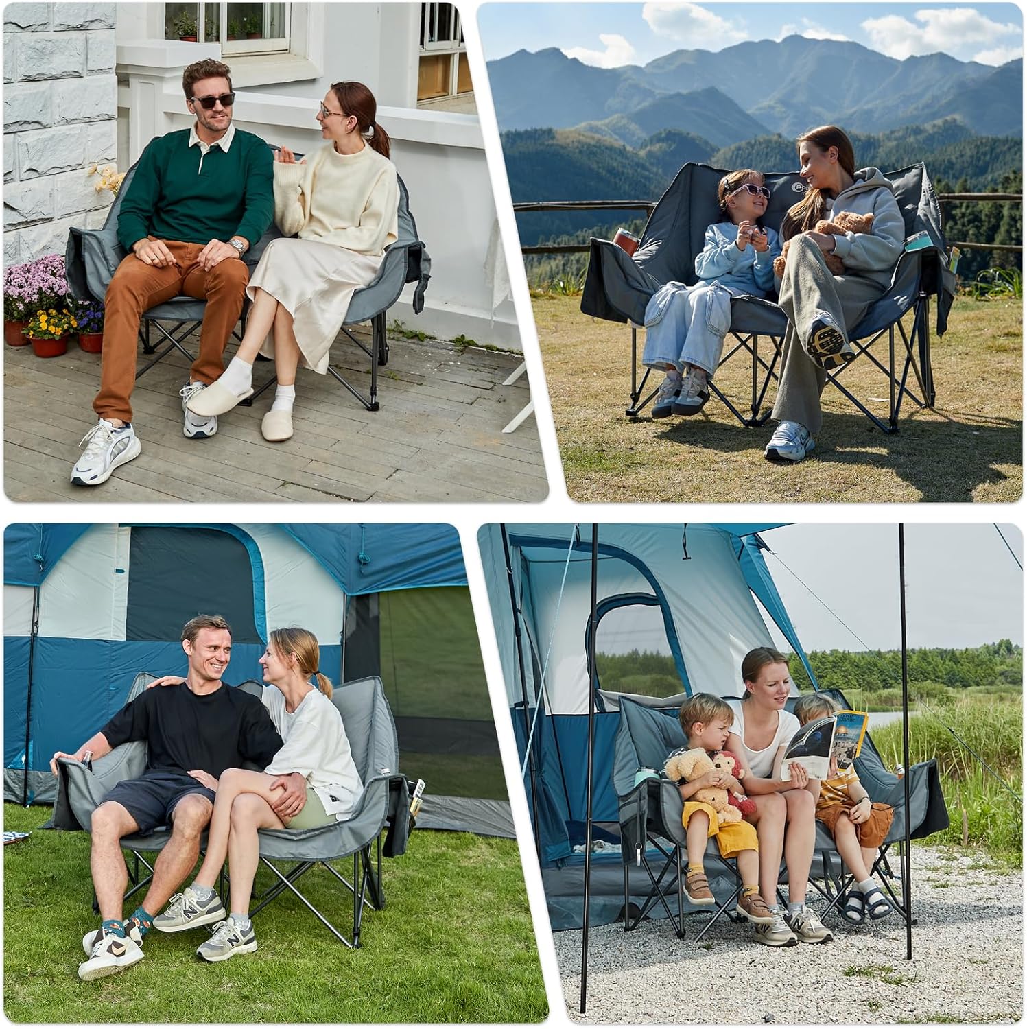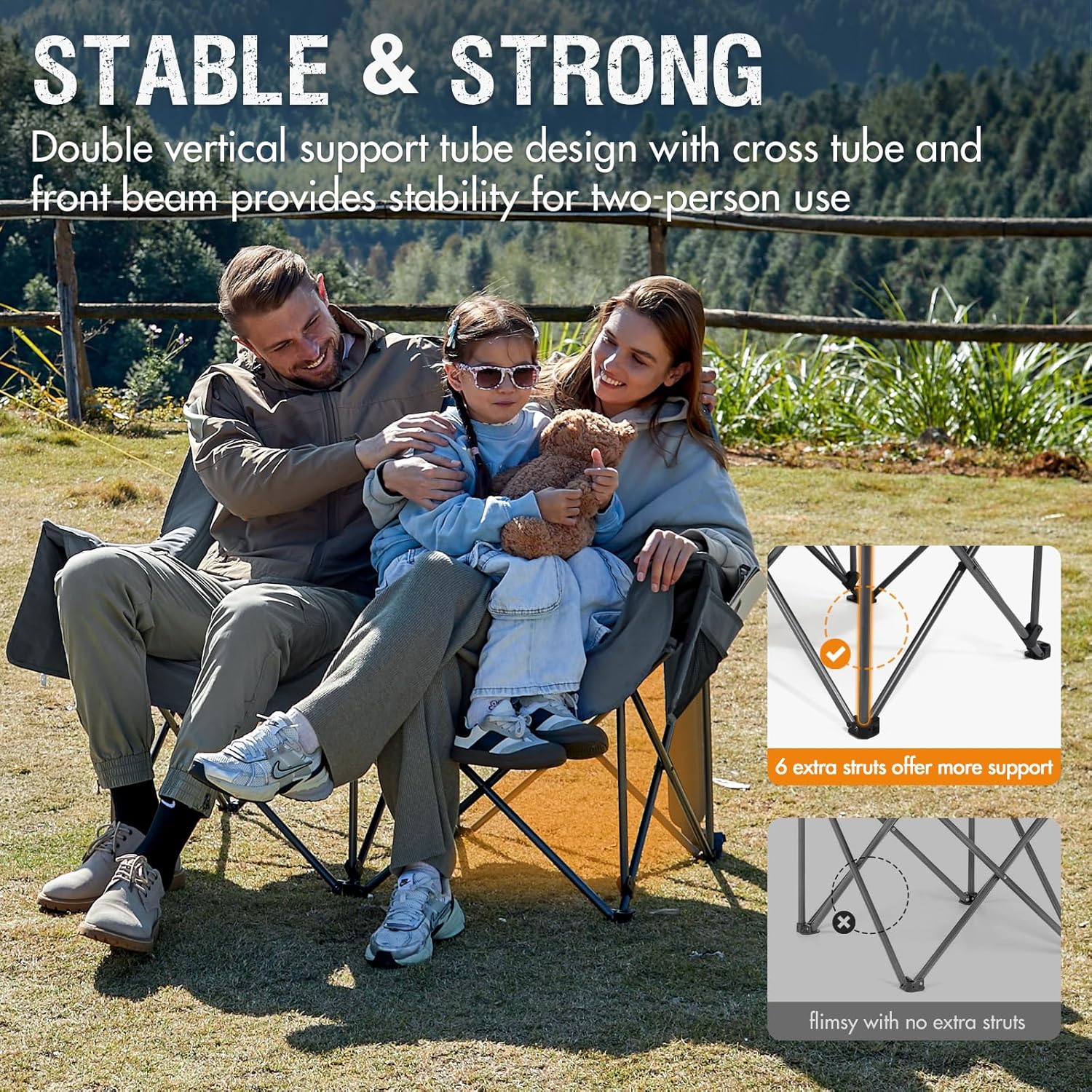 【Heavy-Duty Double Camping Chair】The folding camping loveseat supports up to 600lbs (300lbs per seat) with a reinforced steel frame, dual front support legs, anti-slip foot pads and premium Micro Fiber Peach. This double camping chair has extra anchor points , adding stability on uneven ground.