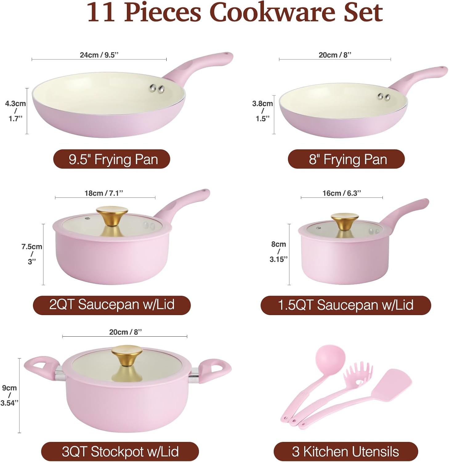 Pots and Pans Set Non Stick, Pink Ceramic Cookware Set, 11-Piece Induction Cookware, Non Toxic Healthy Kitchen Cooking Set, Gold Knobs Lids, Stay-Cool Handles