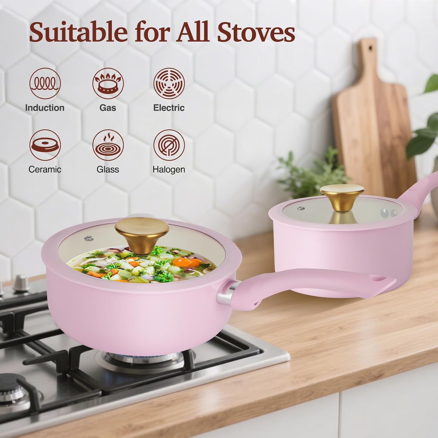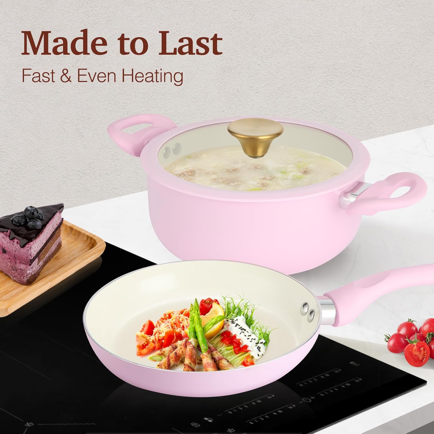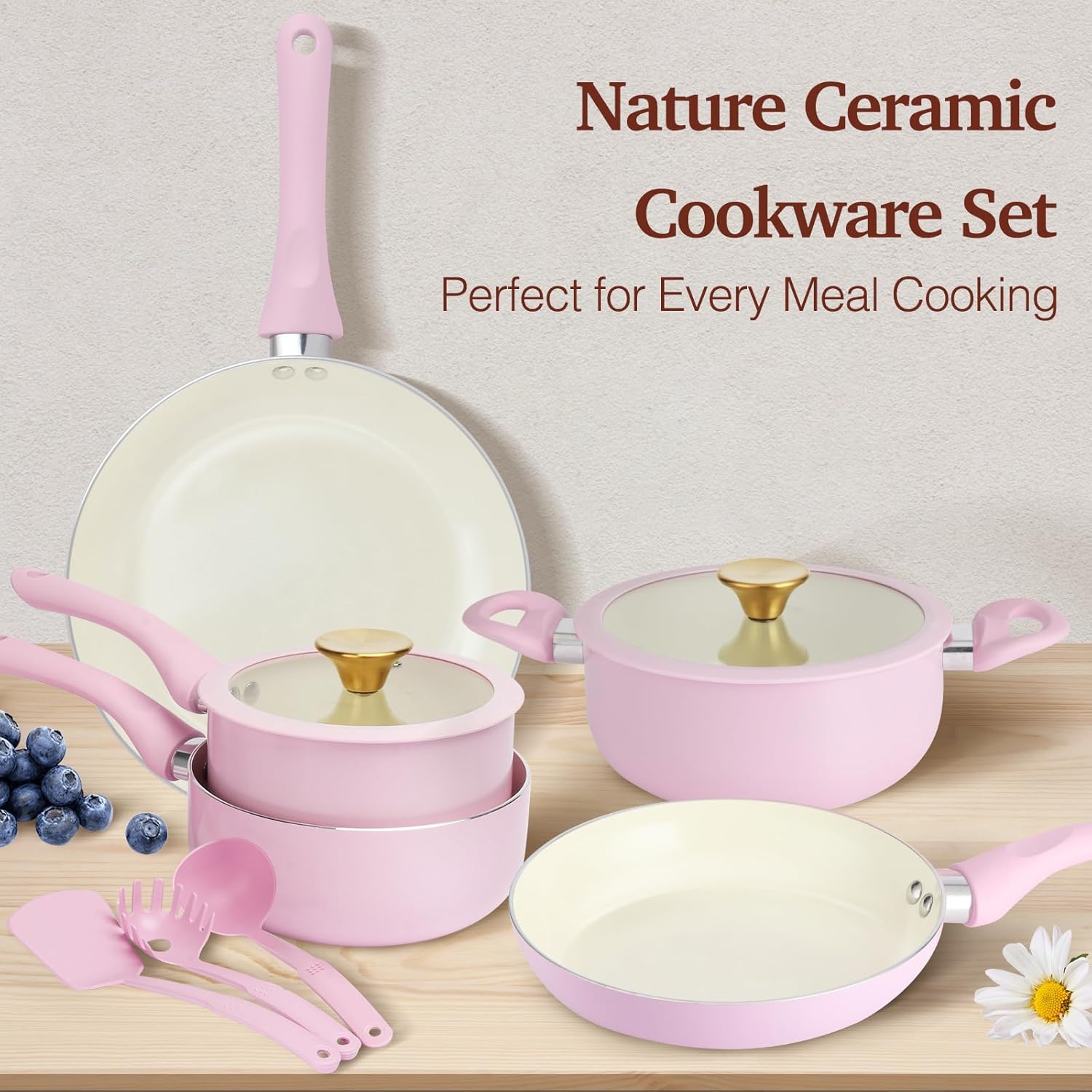 【Fast, Even Heating on Any Stove】Crafted with a thick aluminum core for quick and even heat distribution, this pink ceramic nonstick cookware set helps you achieve consistent cooking results. Its magnetic conductive steel base ensures full compatibility with all cooktops including induction, gas, electric, and glass ceramic