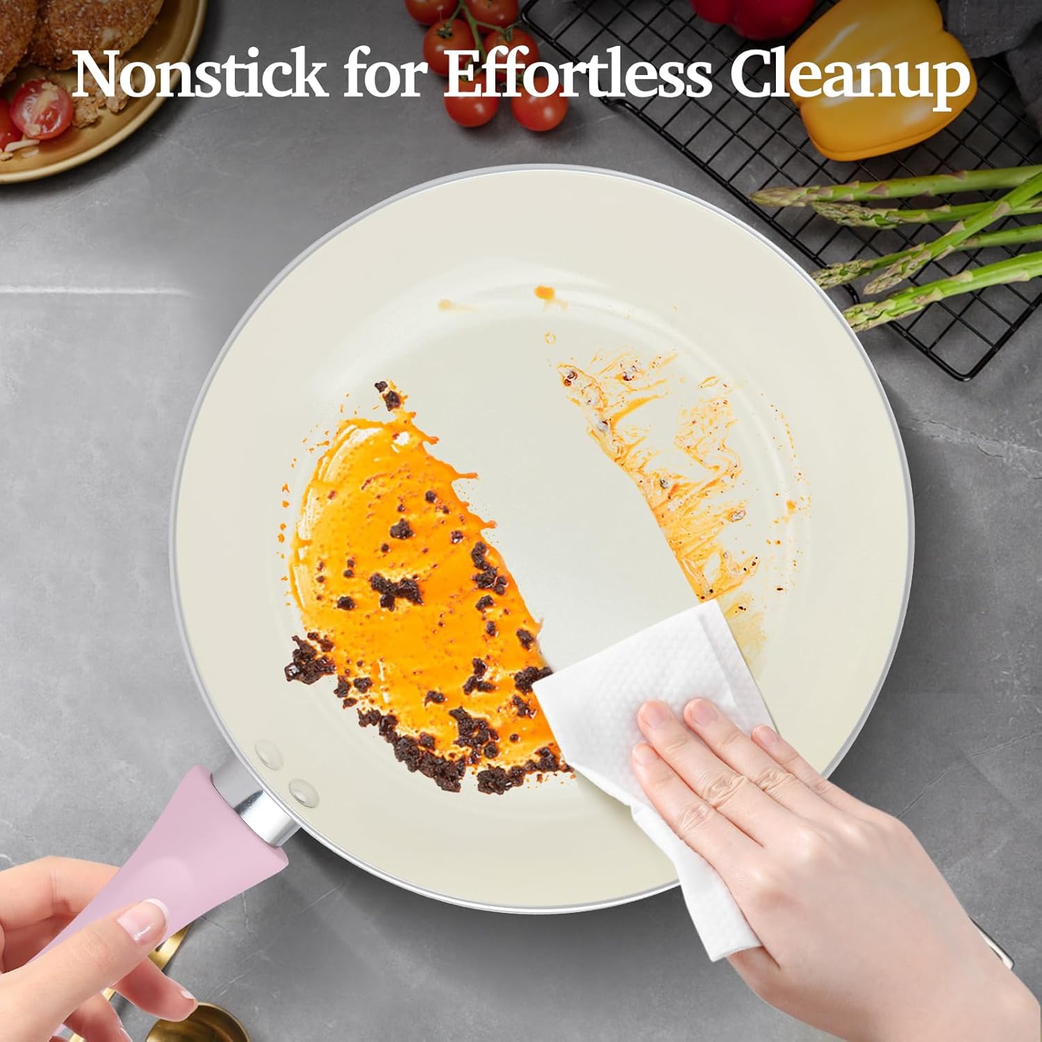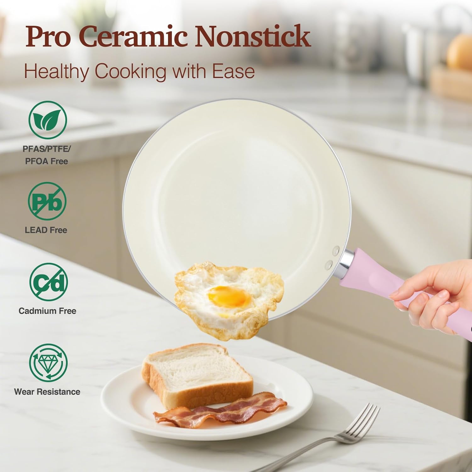 【Safe & Easy-Clean Ceramic Nonstick Cookware Set】The M MELENTA pink cookware set features a premium ceramic coating that’s naturally non-stick, 100% free of PTFE, PFOA, PFOS, PFAS, lead, and cadmium. Enjoy cooking with less oil, no stuck-on food, and a quick rinse cleanup — a truly worry-free surface for everyday meals