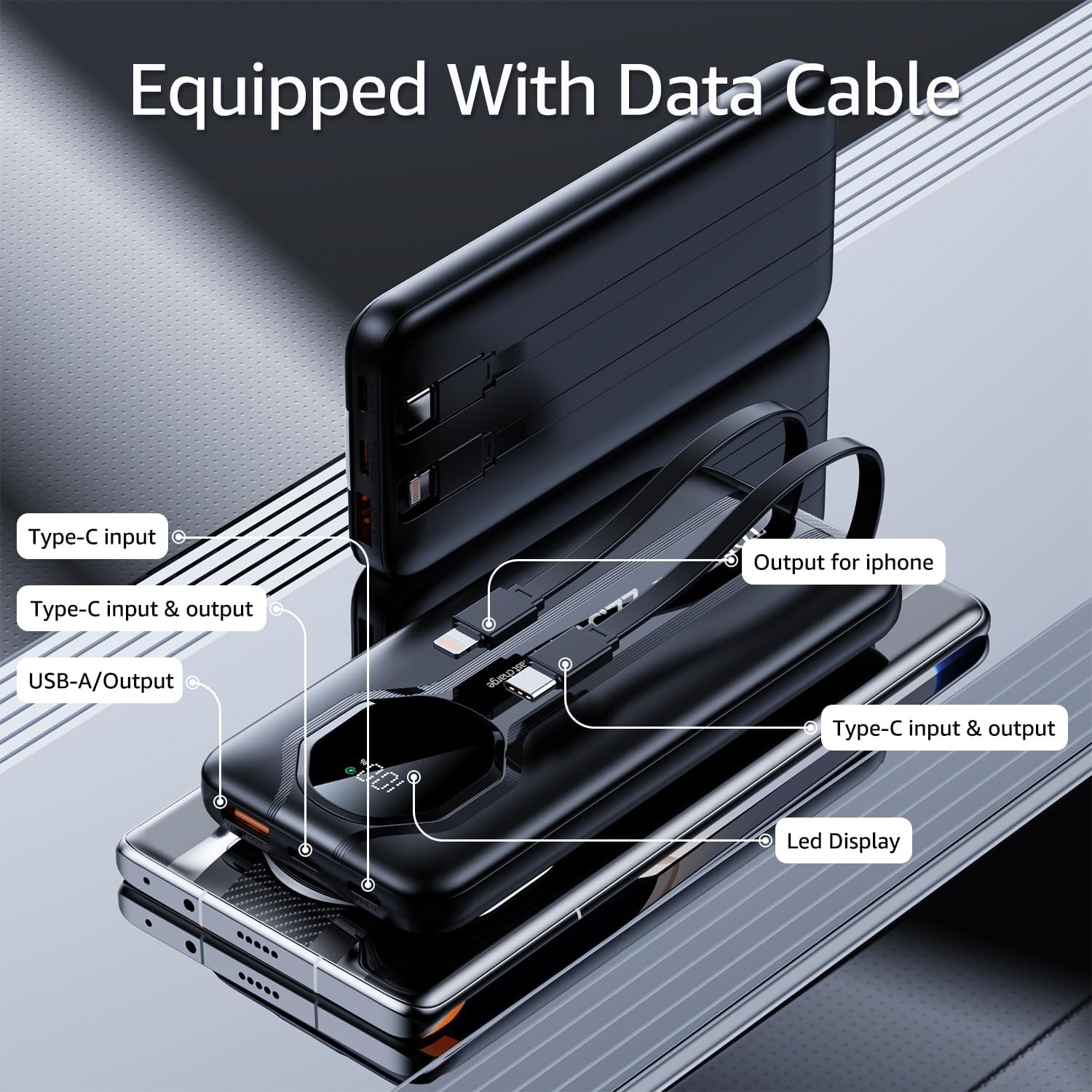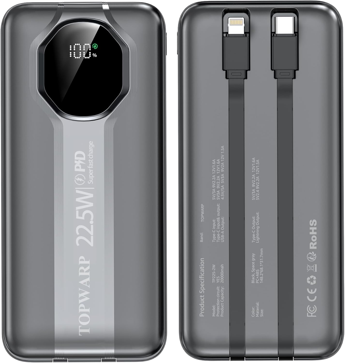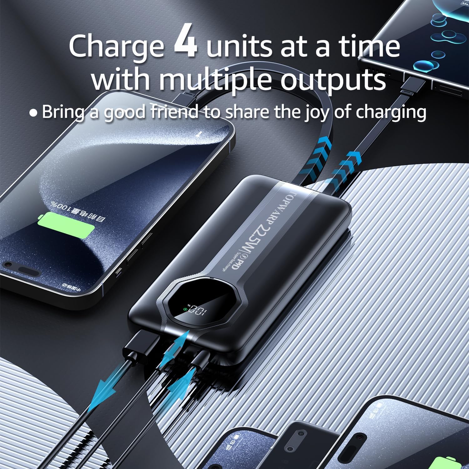 Specification: Power Bank, 20000mha PD 22.5W Portable Charger with 4 Built-in Output Channels 2 Output Cables,QC3.0 Fast Charging Power Bank, for iPhone and Android Phones Most Electronic Devices Space Grey