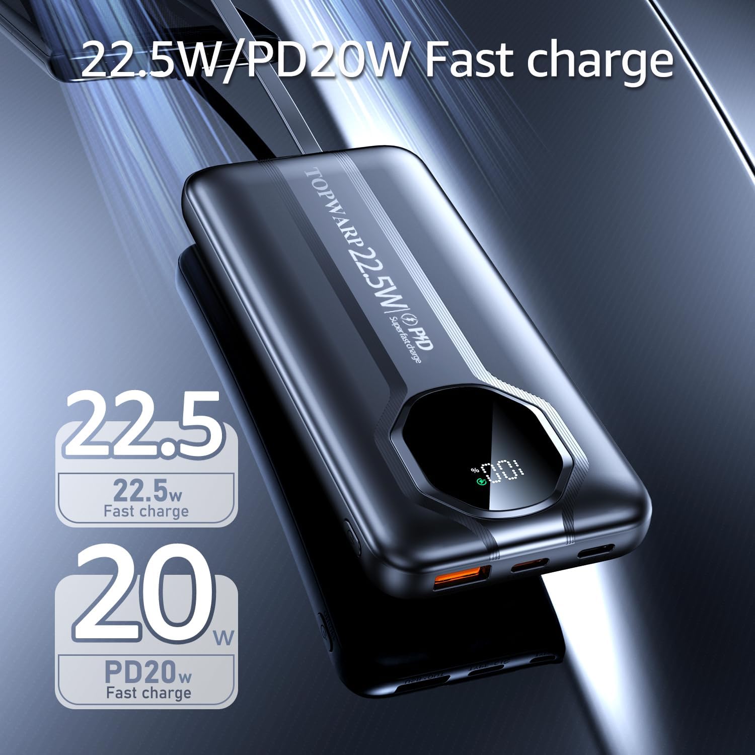 Portable Charger Power bank USB-C port supports PD22.5W fast output and input. USB-A and IOS port supports 20W QC3.0 fast charging output. Charging is one step faster, quickly for you to get rid of the anxiety about the remaining battery power of the phone
