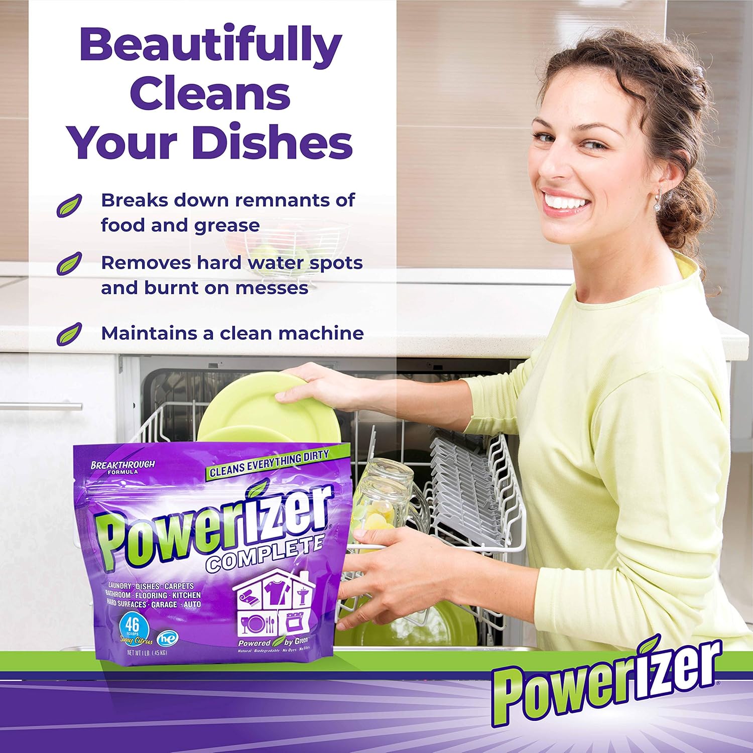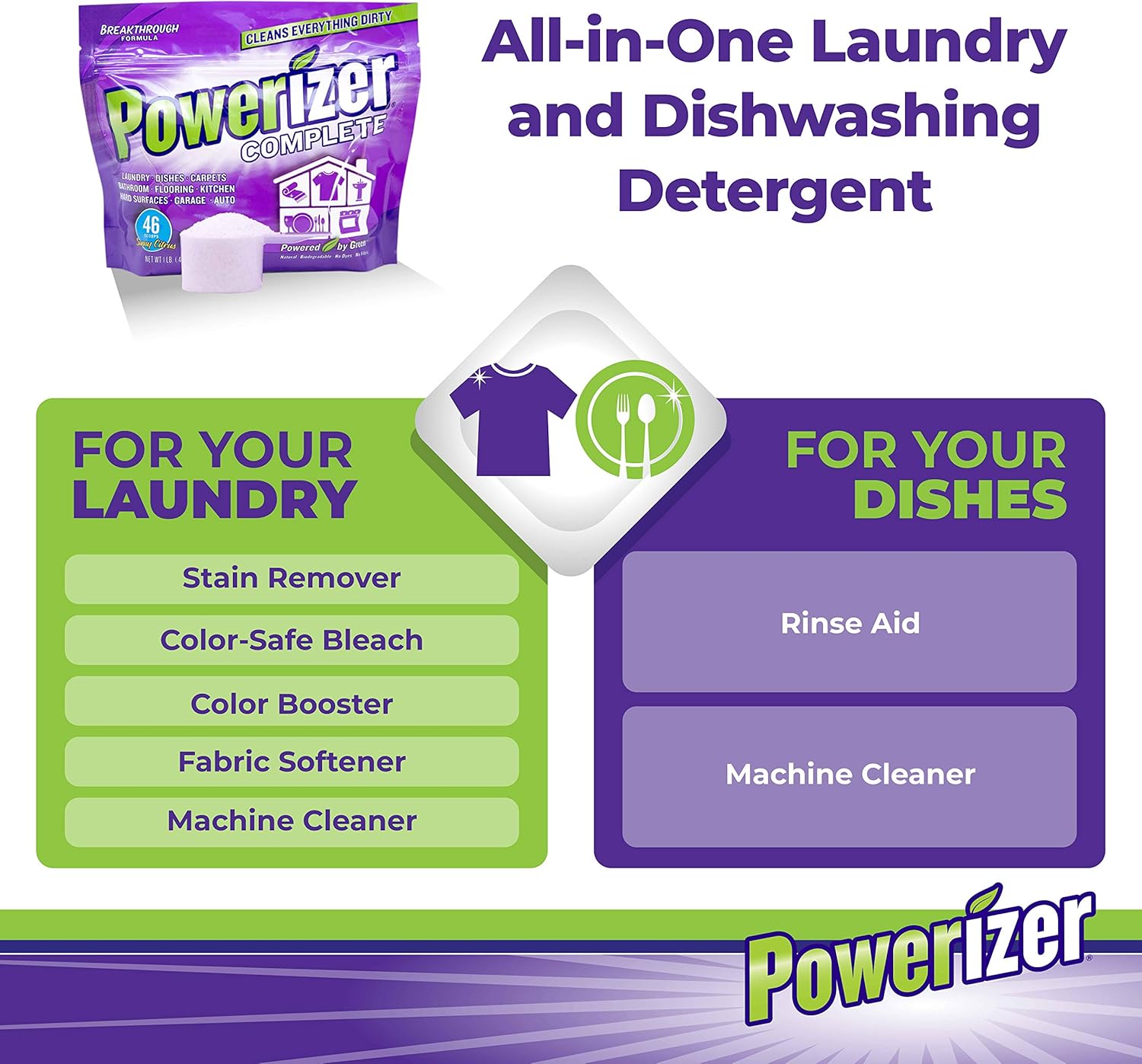 No need to use stain removers, bleaches, color boosters, or softeners. Say goodbye to water softener and rinse aid packets. One scoop of Powerizer Complete powder concentrate works wonders and cleans both machines.