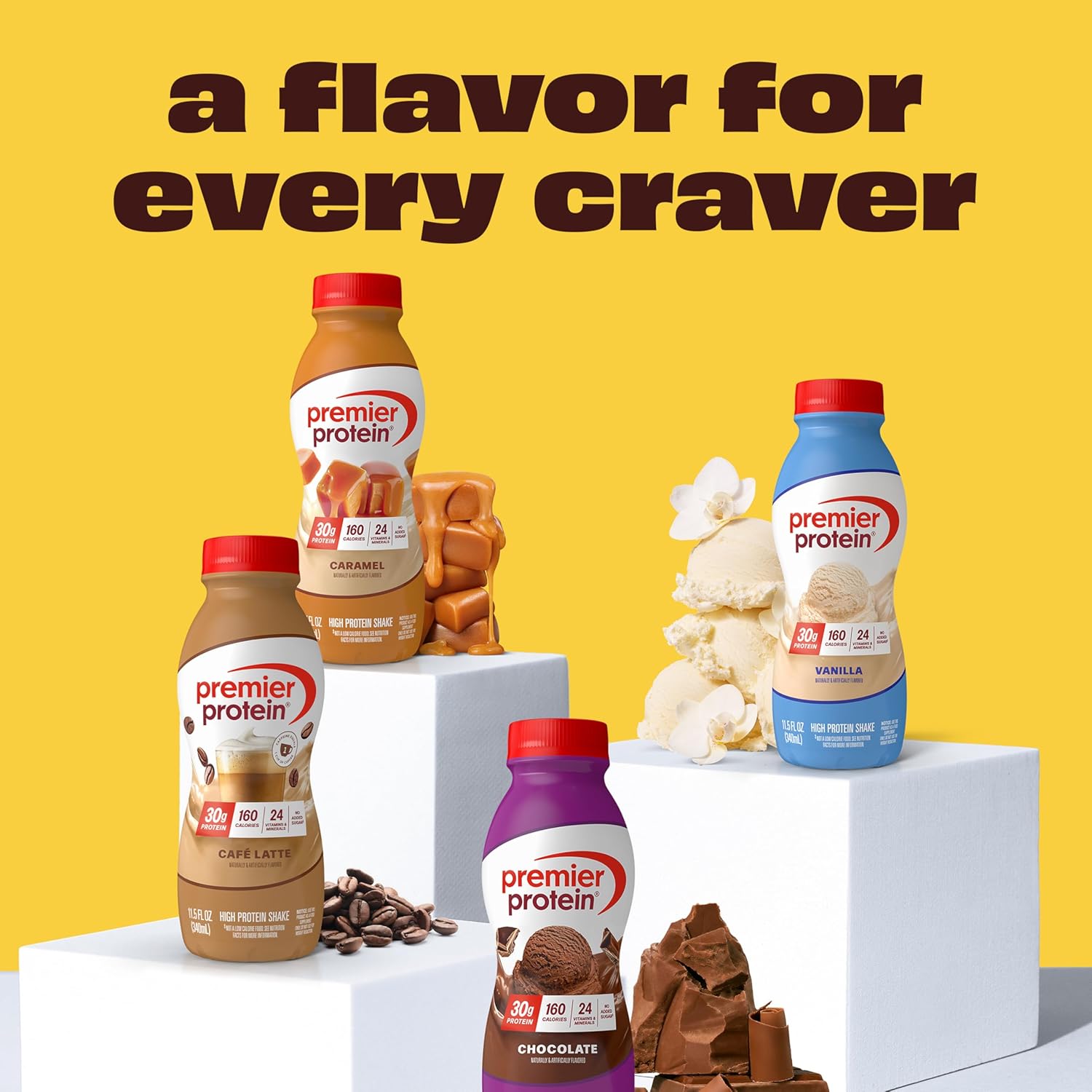 Packaged in an 11.5oz bottle, each Premier Protein Shake contains 30g of protein, complete with all the essential amino acids, 1g of sugar, 3–5g of carbs (depending on flavor), 160 calories, 24 vitamins and minerals, and is also low in fat. We use a blend of milk protein concentrate and calcium caseinate to help support your fitness goals. Enjoy a shake as a healthy snack, a breakfast on the go, or as post or pre-workout fuel. They are delicious as is but also highly customizable. Blend with your favorite fruits and vegetables in a smoothie, pour over cereal or oatmeal, or use as a base for proffee (protein coffee) or protein ice cream. Available in 12 core flavors: Bananas & Cream, Cake Batter Delight, Cafe Latte, Caramel, Chocolate, Chocolate Peanut Butter, Cinnamon Roll, Cookie Dough, Cookies & Cream, Peaches & Cream, Strawberries & Cream, and Vanilla. (Seasonal flavors also available for a limited time.)