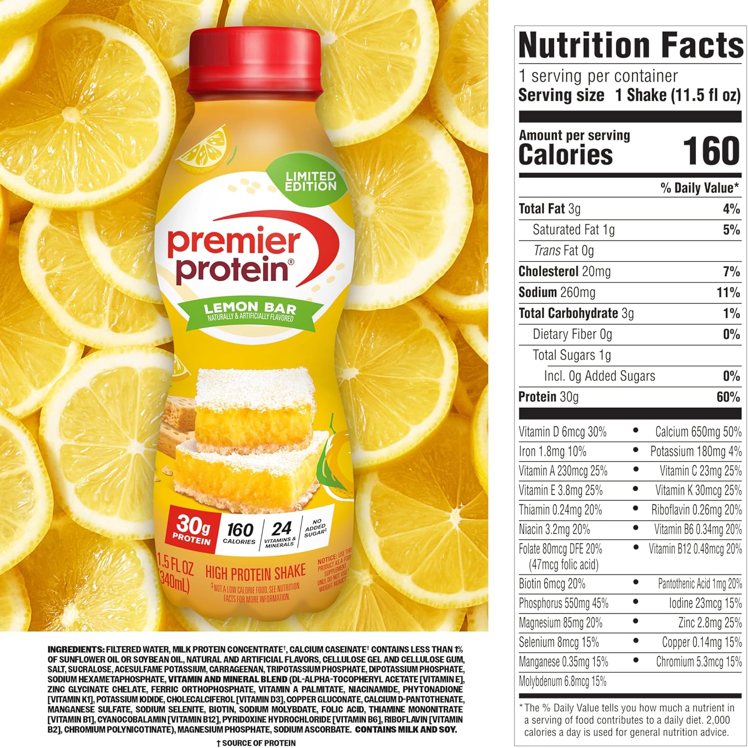 Premier Protein Shake, Limited Edition, Lemon Bar, 30g Protein, 1g Sugar, 24 Vitamins & Minerals, 11.5 oz, 12 Pack