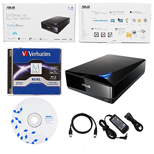 Produplicator Asus 16x External Blu-ray Drive with BD Suite Disc, USB 3.0 Cable, Power Adapter and Cord (BW-16D1X-U) Bundle with 100GB Verbatim M-DISC BDXL