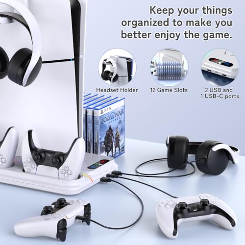 PS5 Cooling Station for PS5/Slim/Pro Disc Digital Console,PS5 Fan Cooling Fan with Dual PS 5 Controller Charger,3 Level Fan, RGB Light,12 Slot, PS5/Slim/Pro Stand for PlayStation 5 Console Accessories
