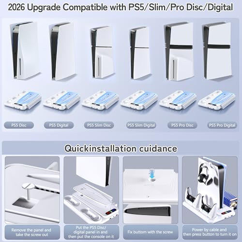 【Fast Dual PS5 Controller Charger】Fully Charge two PS5 DualSense controllers simultaneously in just three hours. The LED indicator will show the charging status of 2 PS5 controllers clearly. Red means charging, blue means standby or fully charged. The ps5 slim cooling station has overcharging, overcurrent, overvoltage and overheating protection to ensure the PS5 controllers are charged safely. 2026 upgrade version,Perfectly compatible with PS5/PS5 Slim/PS5 Pro console disc versions and digital versions.