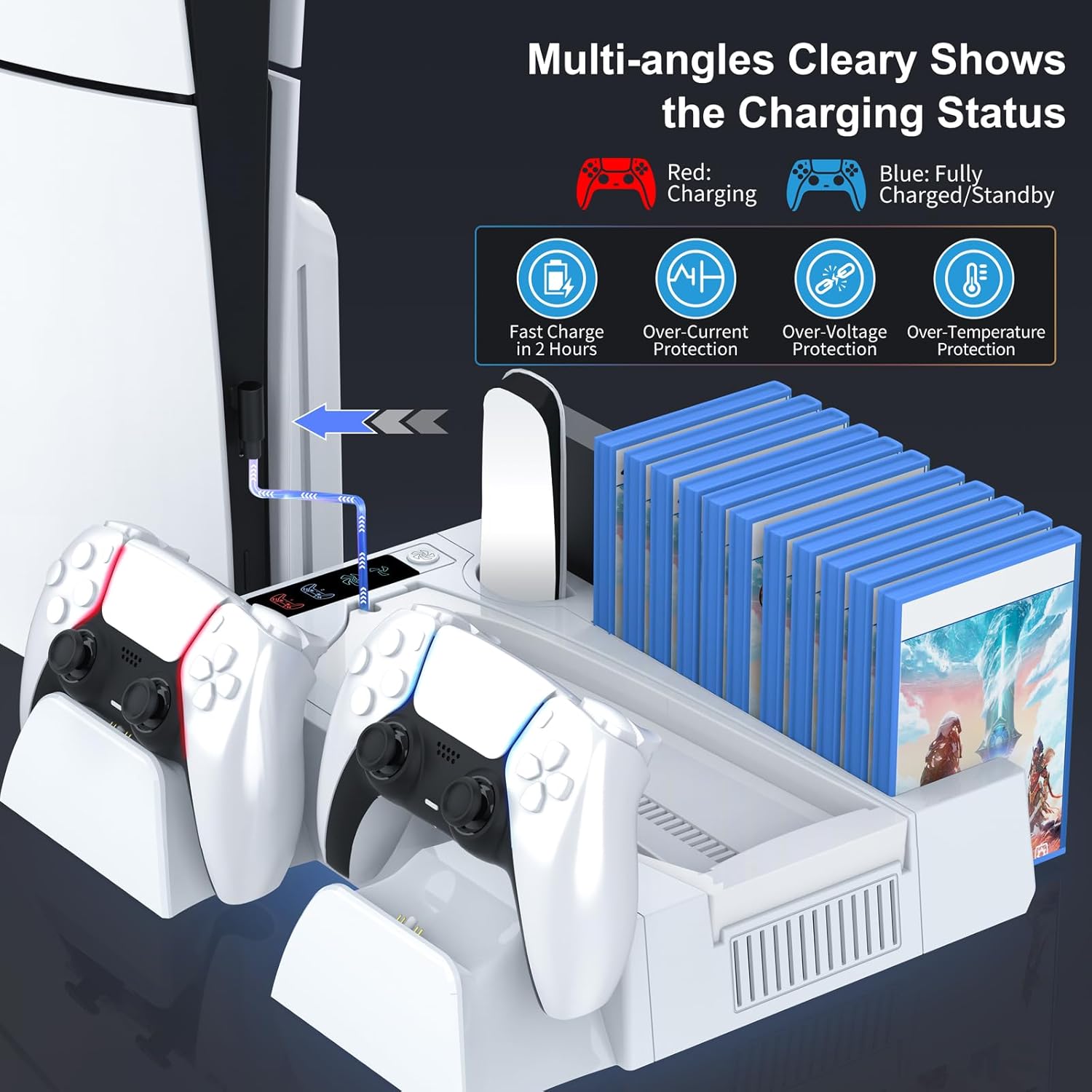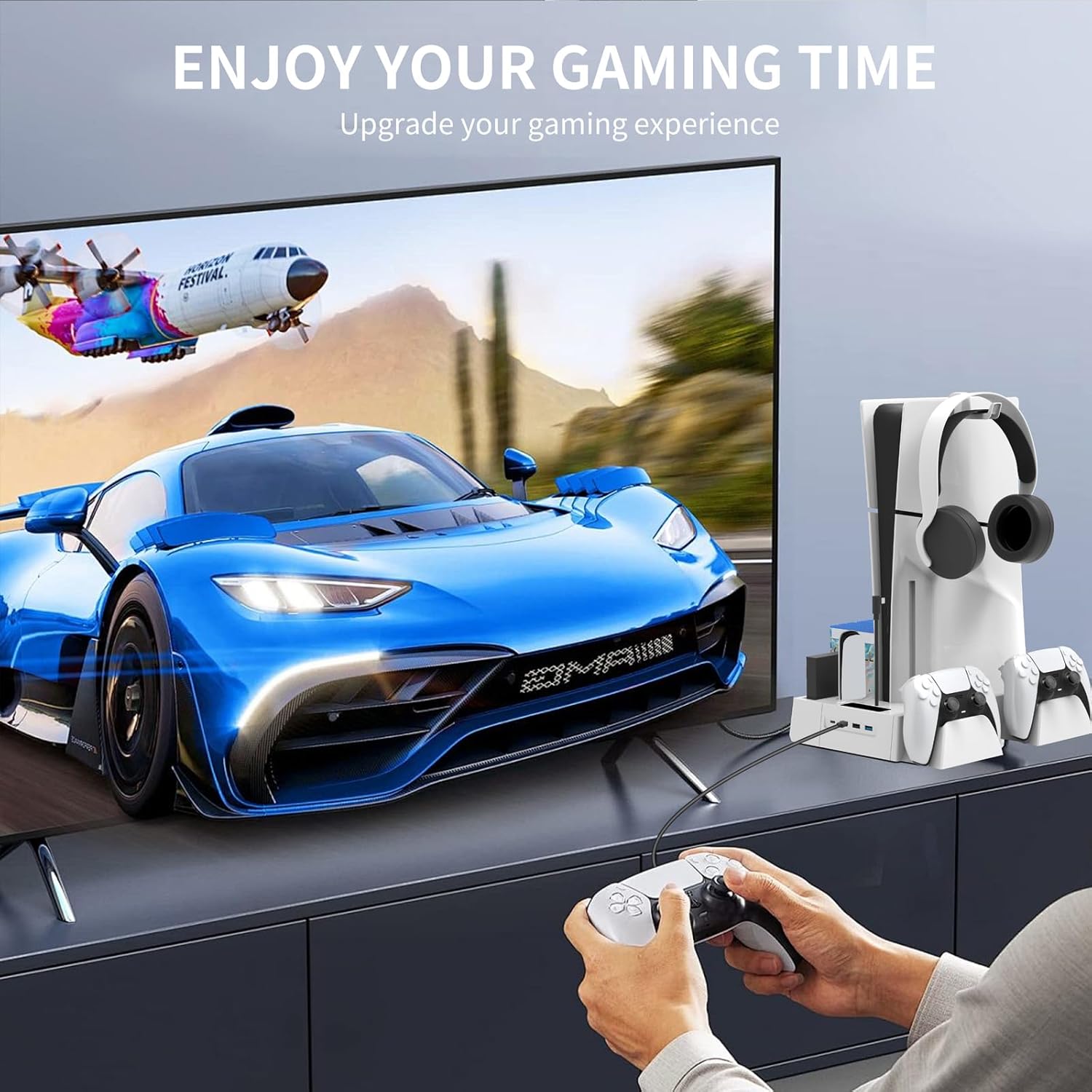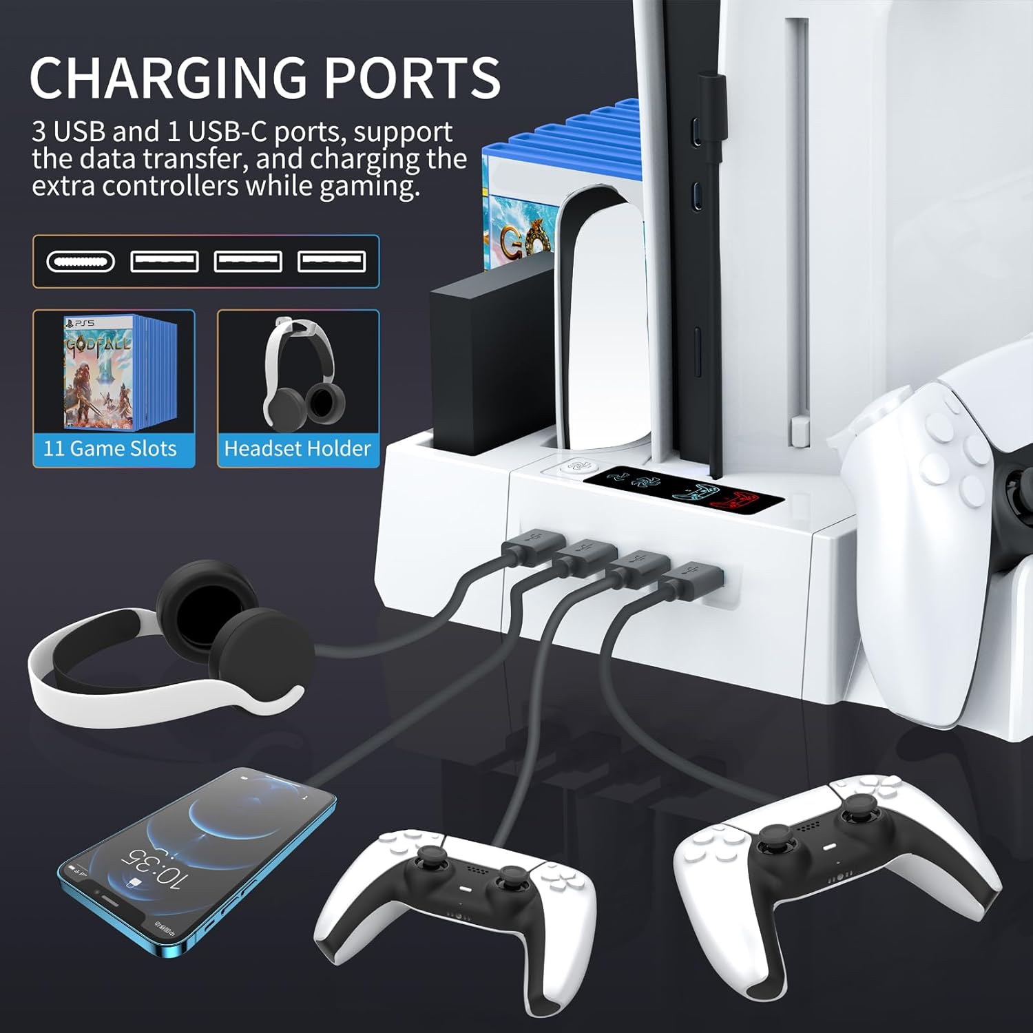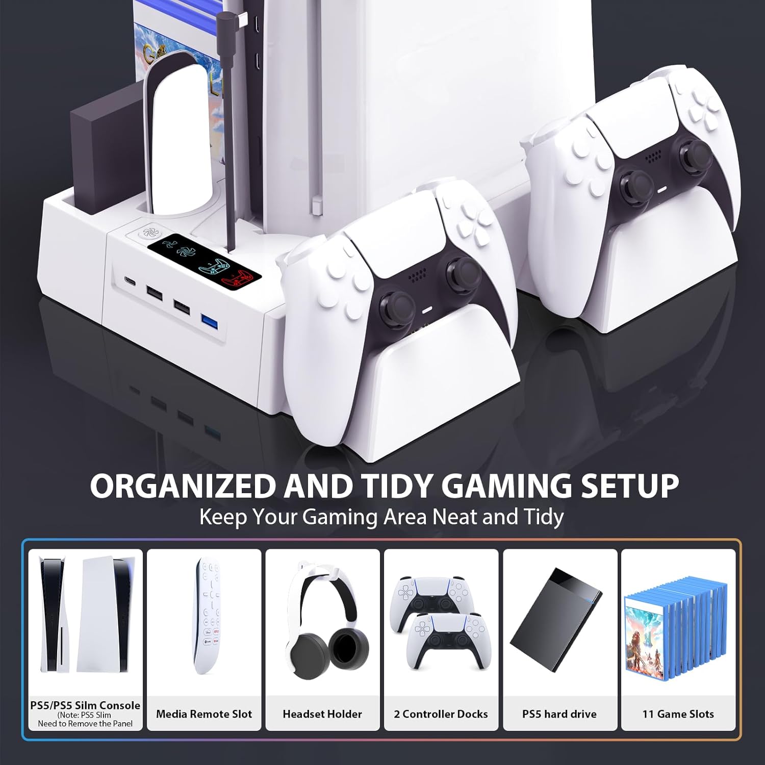 All-in-One PS5 Accessories Organizer: This PS5 cooling station is designed to hold 11 game disc, ps5 headset, ps5 controllers, ps5 media remote, and your ps5 console all in one place. It helps save space, keeping your favorite games at your fingertips and your gaming area tidy. It’s a great choice for ps five gamer who need a neat organizer for tons of gaming accessories.