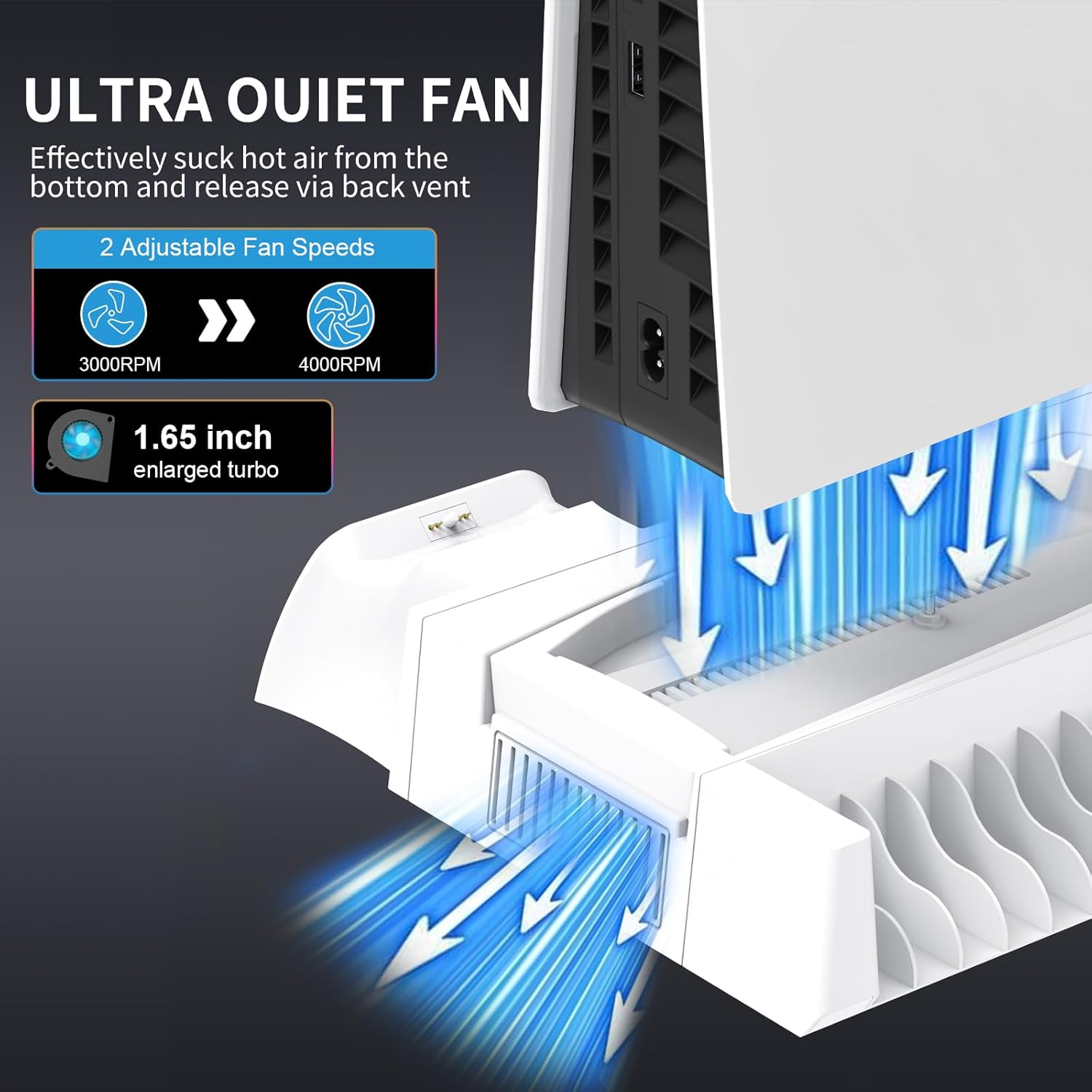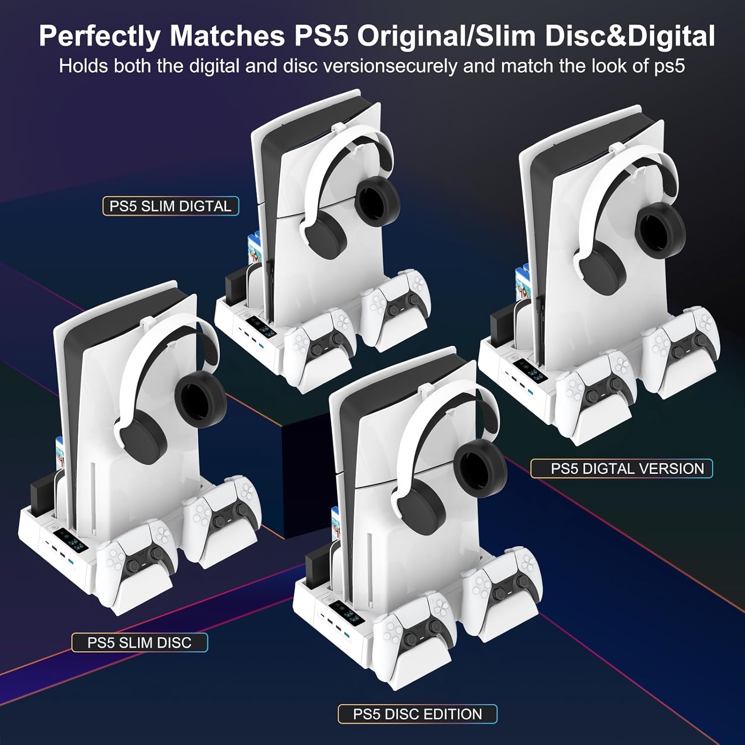 Warm Tips: Fivtek ps5 cooling station compatible for 2023 Playstation 5 Slim Disc/ Digital & 2020 Playstation 5 Standard Disc/ Digital Console; NOT work for 2024 Playstation 5 Pro Console.