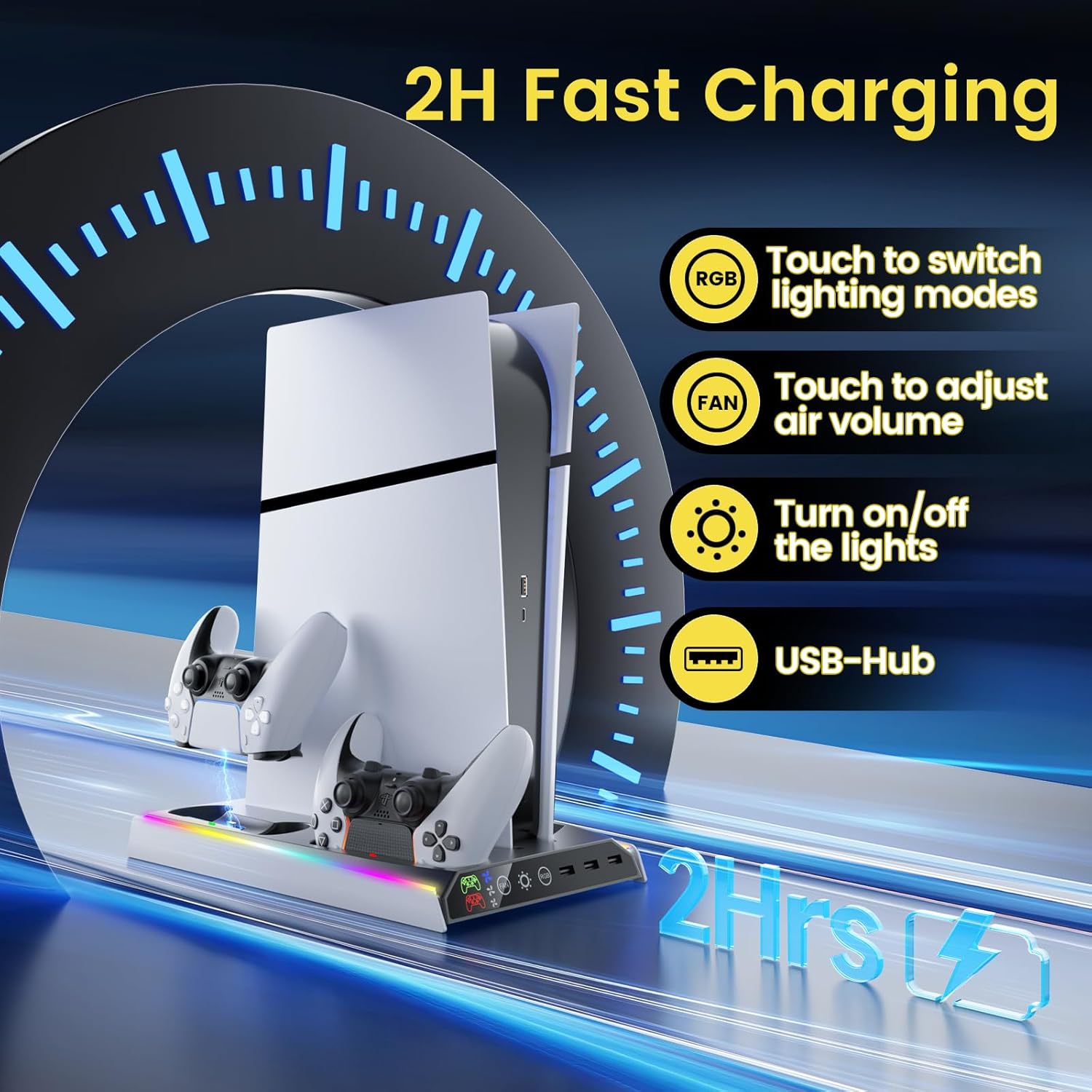 PS5/PS5 Slim/Pro Stand with Adjustable Cooling Fan, PS5 Cooling Stand for PS5/PS5 Slim/Pro, PS5 Cooling Station with Dual Controller Chargers and RGB Light for 3DS Skins