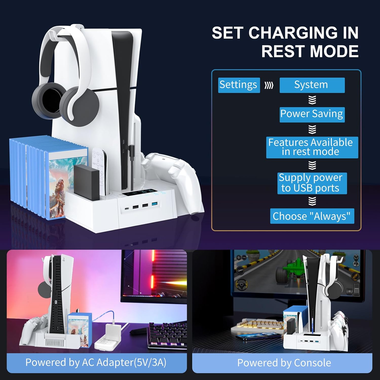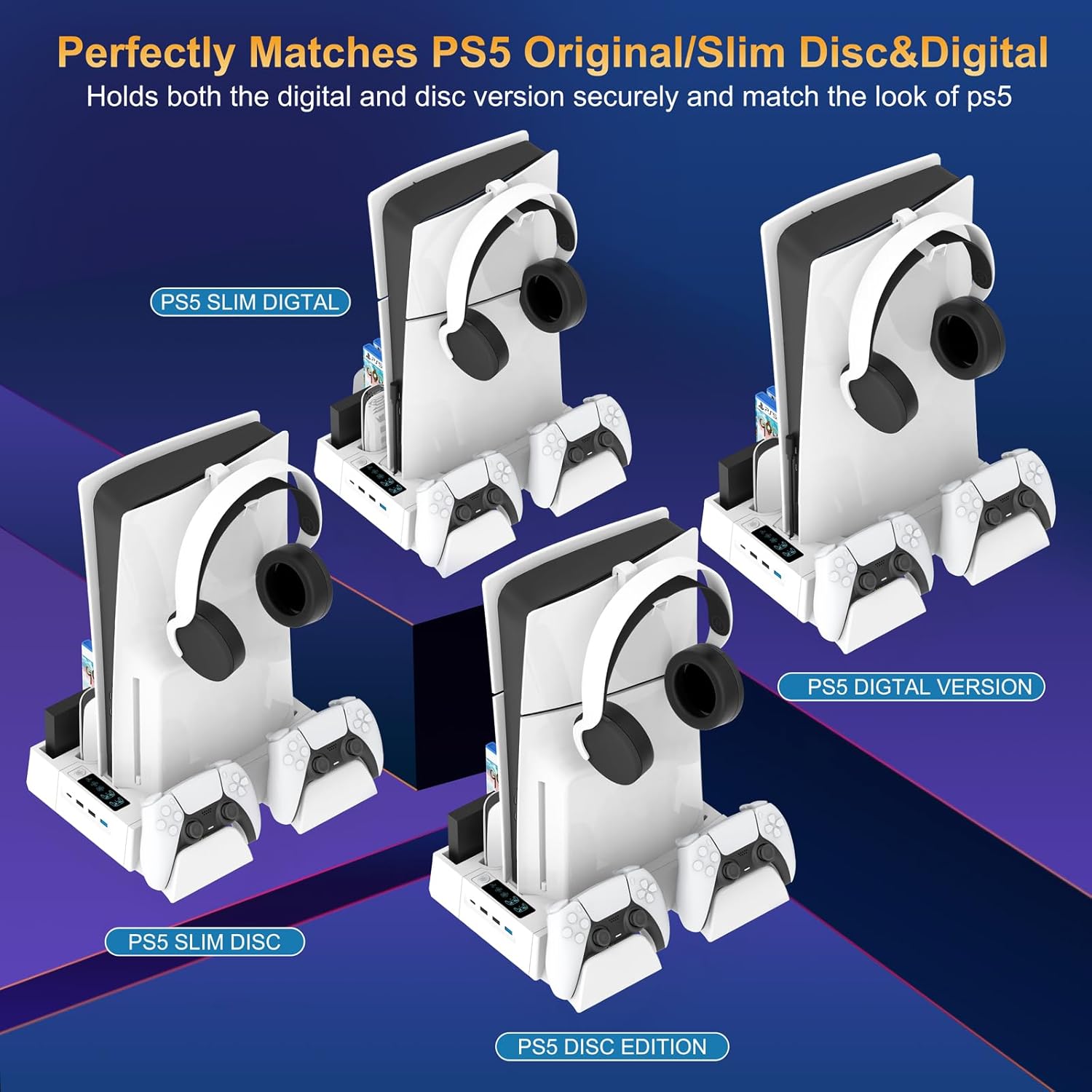 MULTIFUNTIONAL DESIGN: This PS5 cooling station is Compatible with 2020/2023 Slim Playstation 5 Digital Edition and Disc edition console. It includes interchangeable panels that allow to adjusted according to the PS5 console model. Includes a screw lock to keep ensuring a firm and secure installation. The whole white color color and vertical design not only saves space but also adds an aesthetic touch to the gaming area. More important, the vertical design also improve cooling efficiency.