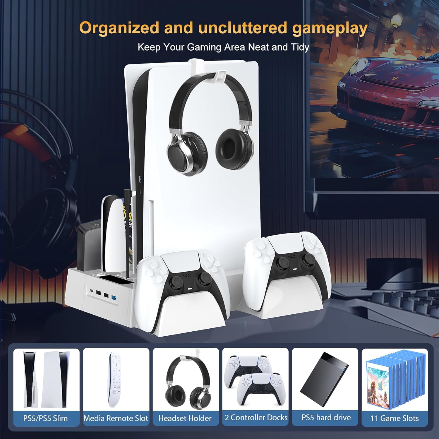 PERFECT STORAGE DESIGN WITH GAME SLOT AND USB PORT: iPLYGAM’s PS5 cooling stand built perfect storage space for Sony game fans. It can storage 11 game disc, PS5 hard drive external, PS5 media remote, PS5 headset and your PS5 console. Keeping all Playstation 5 accessories neat and organized. Our PS5 cooling station also features 3 additional USB port and 1 type C for charging anything that you want, such as headsets, mobile phones and your other game controller/console.
