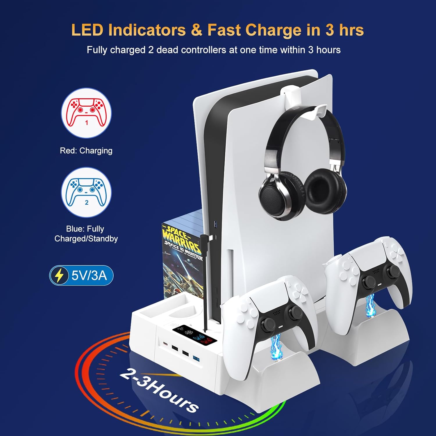 DUAL WIRELESS CONTROLLER CHARGING DOCK: This PS5 Cooling stand can charging two PS5 controllers simultaneously without messy cable, keeping everything organized. With the indicator light showing the charging status. Red means charging, blue means standby or fully charged. Perfect all-in-one solution to keep your PS5 console cool and ensuring your two controllers are charged. Great ps5 accessories which replacement for sony official station.