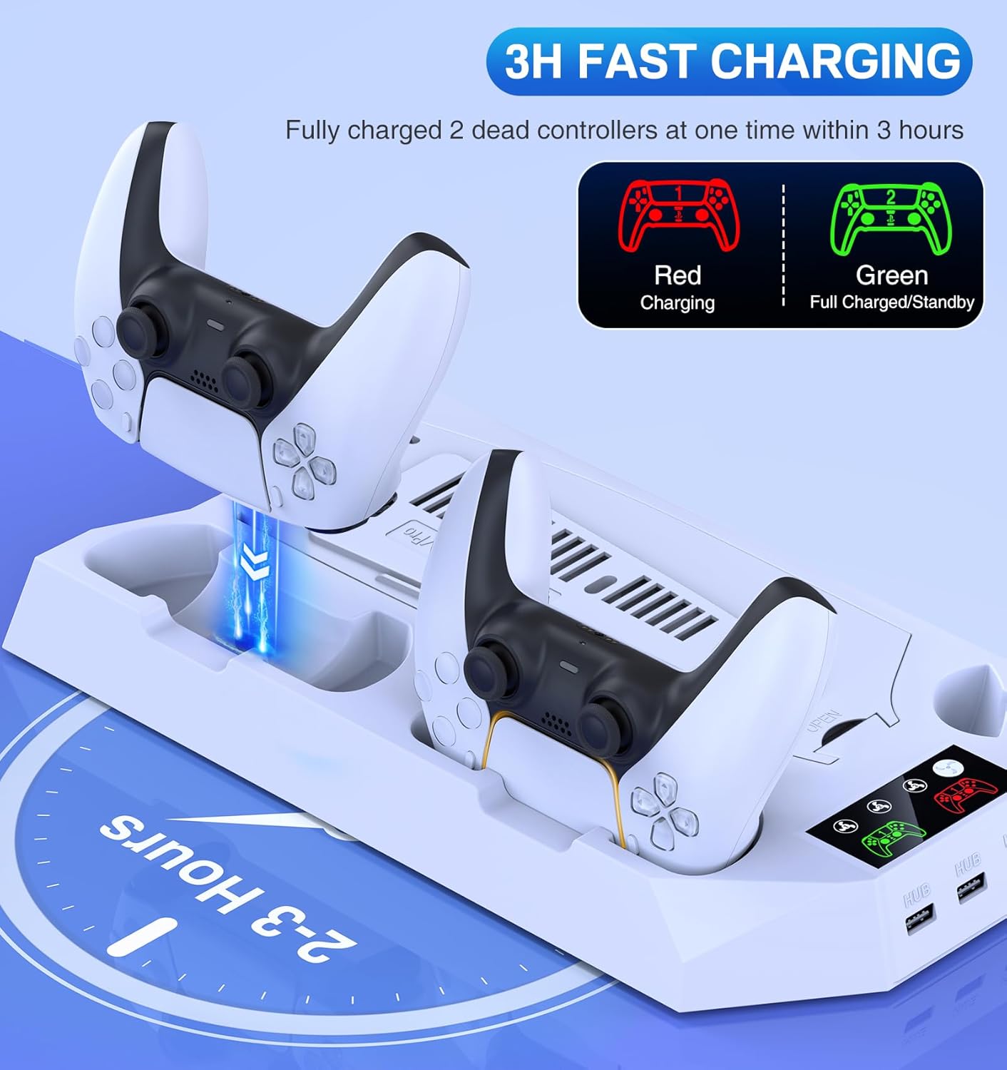 2H FAST CHARGING WITH DUAL CONTROLLER CHARGER: This ps5 slim stand with cooling fan and controller charger achieves to charge 2 ps5 controllers with 1 cord plugged in playstation 5 console so only waste 1 usb port instead of both. Easy for dualsense controllers charging in one ps5 charger station at once and the LED indicators can clearly display the charging status of the ps5 controller(Red – charging; Green – fully charged or standby). The ps5 pro cooling station and charging dock will charge 2 ps5 controllers within 2h so that at least 1 hour could be saved