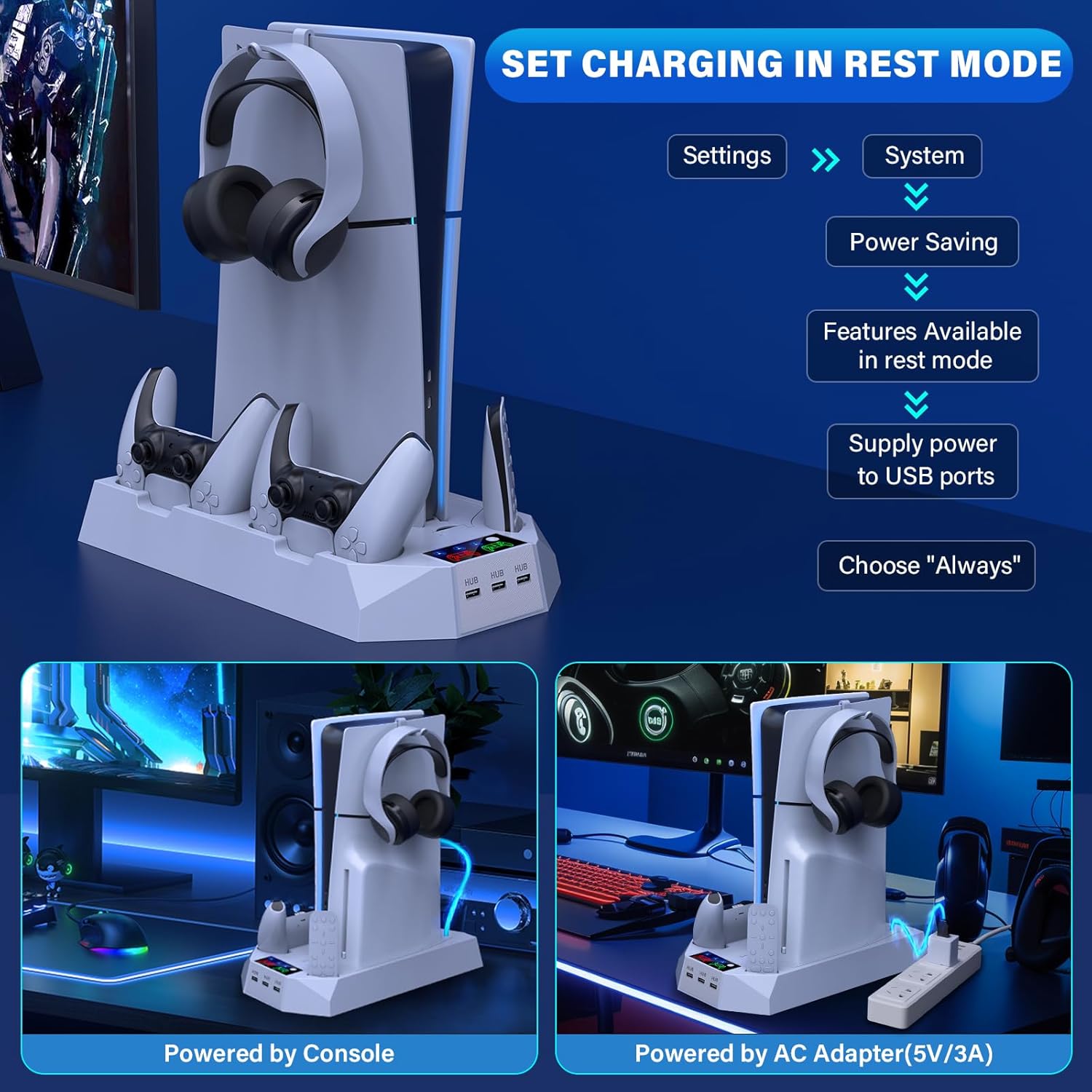 TWO POWERED WAYS FOR PS5 COOLING CHARGING STATION: The ps5 slim cooling charging stand can be powered by ps5 console and 5V/3A AC adapters, via the USB C cable. Charge the ps5 controller and cool down the ps5 slim/ps5 pro/ps5 console although the ps5 console is in rest mode. Adopted smart chip for ps5 station, the ps5 slim/pro charging stand provides ps5 controllers with over-charge, over-heat, over-voltage and short circuit protection. Package List: ps5 cooling stand x1, usb cable x1, headset holder x1