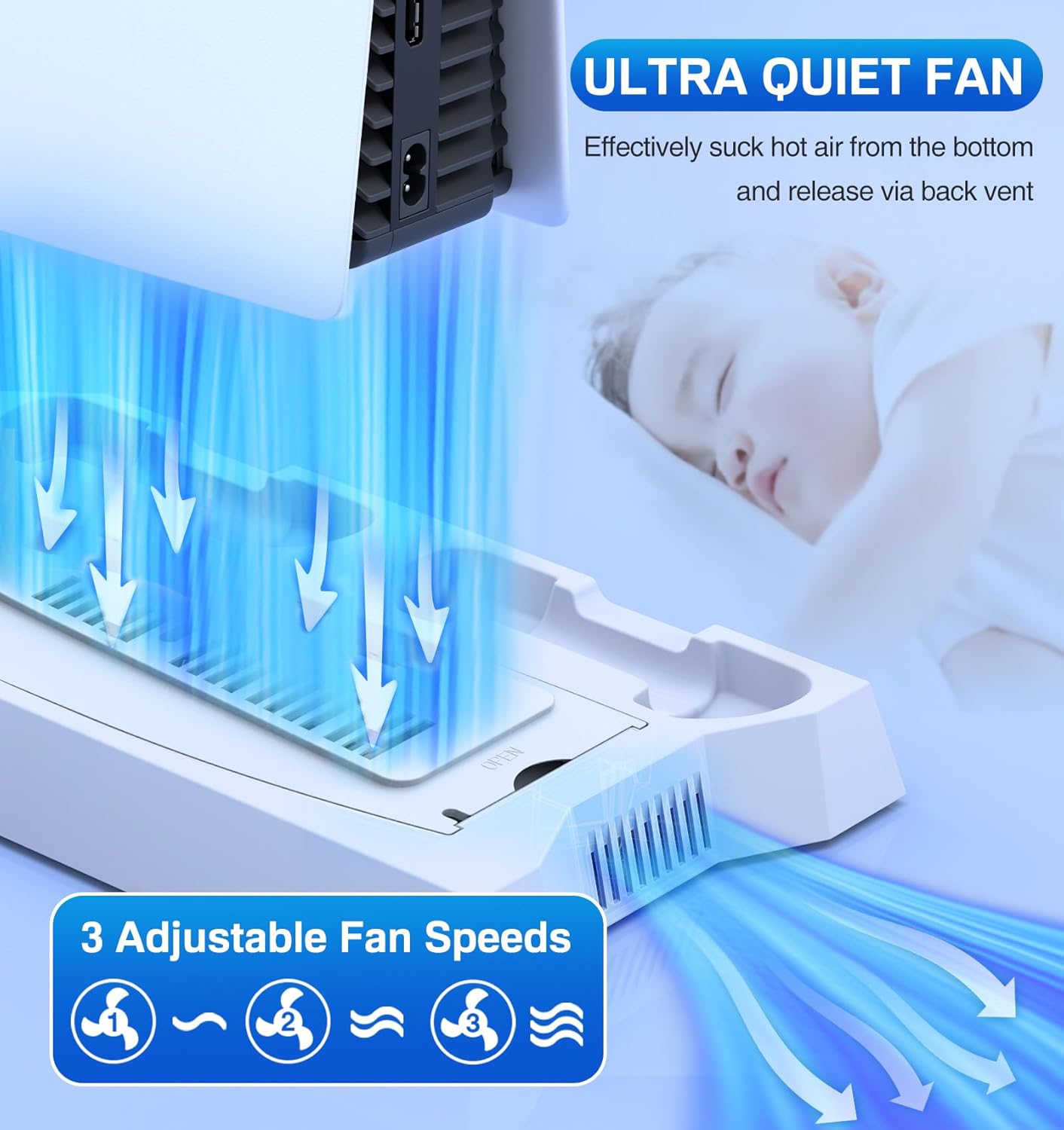 3 USB PORTS+3 ADJUSTABLE COOLING FAN SPEEDS: This ps5 pro ps5 slim cooling station with charger provides gamers with 3 more USB ports for ps5 console, which can be used to charge ps5 controllers, ps5 headset, ps5 HD camera and other external USB devices. The ps5 pro stand with charging station has a 3 adjustable speeds (high, mid, low) cooler fan to blow the heated air away from the bottom of the ps5 console and keep it always cooled down. The ps5 slim pro cooling fan can be turned on/off by switching the speed level