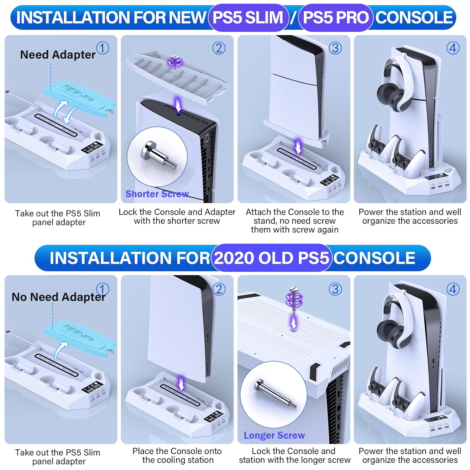 1 HEADSET STAND+1 MEDIA REMOTE HOLDER+1 METAL SCREW: A headset hanger, a media remote slot and a metal screw are coming with the ps5 cooler station. Use the metal screw to lock the ps5 console into the cooling station stand for ps5 slim/ps5 pro/ps5 console to achieve secure and stable. This ps5 charging station with cooling fan helps well organized ps5 controller accessories, ps5 headset, media remote in one place