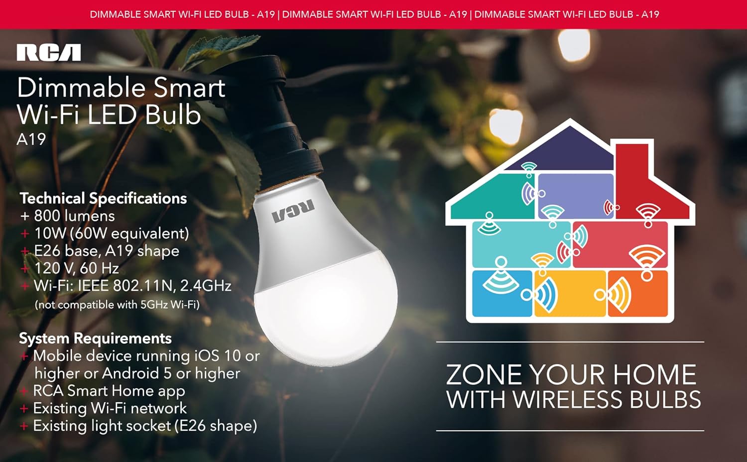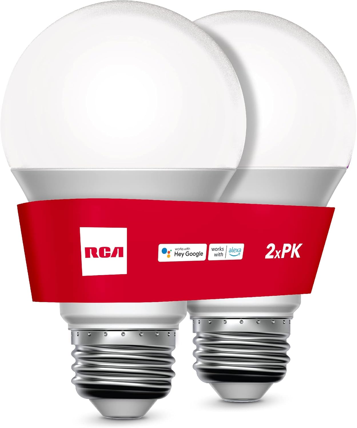 RCA Smart Light Bulbs, WiFi LED Light Bulb, Dimmable LED Lights, Dimmable 800 Lumens 10W (60W EQ A19), Compatible with Alexa and Google, Control from Anywhere with Smartphone, 2700K Soft White, 2-PK