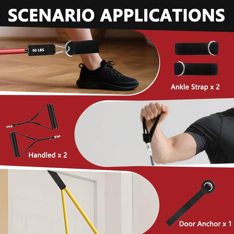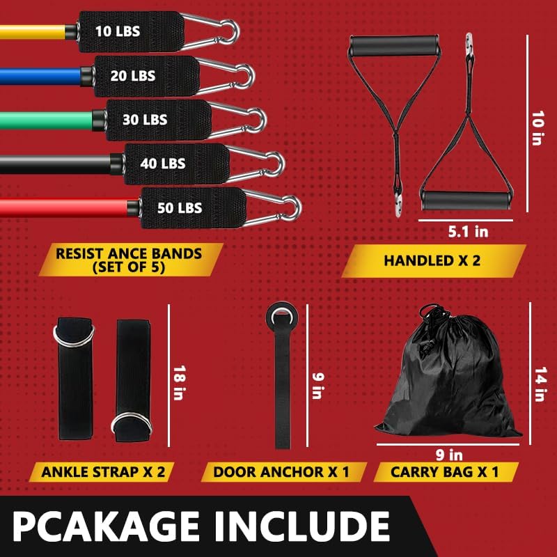 Resistance Bands Set Includes: 5 exercise bands, 2 cushioned handles, 2 ankle straps, 1 door anchor, 1 carrying bag. No additional equipment is needed for efficient strength training.