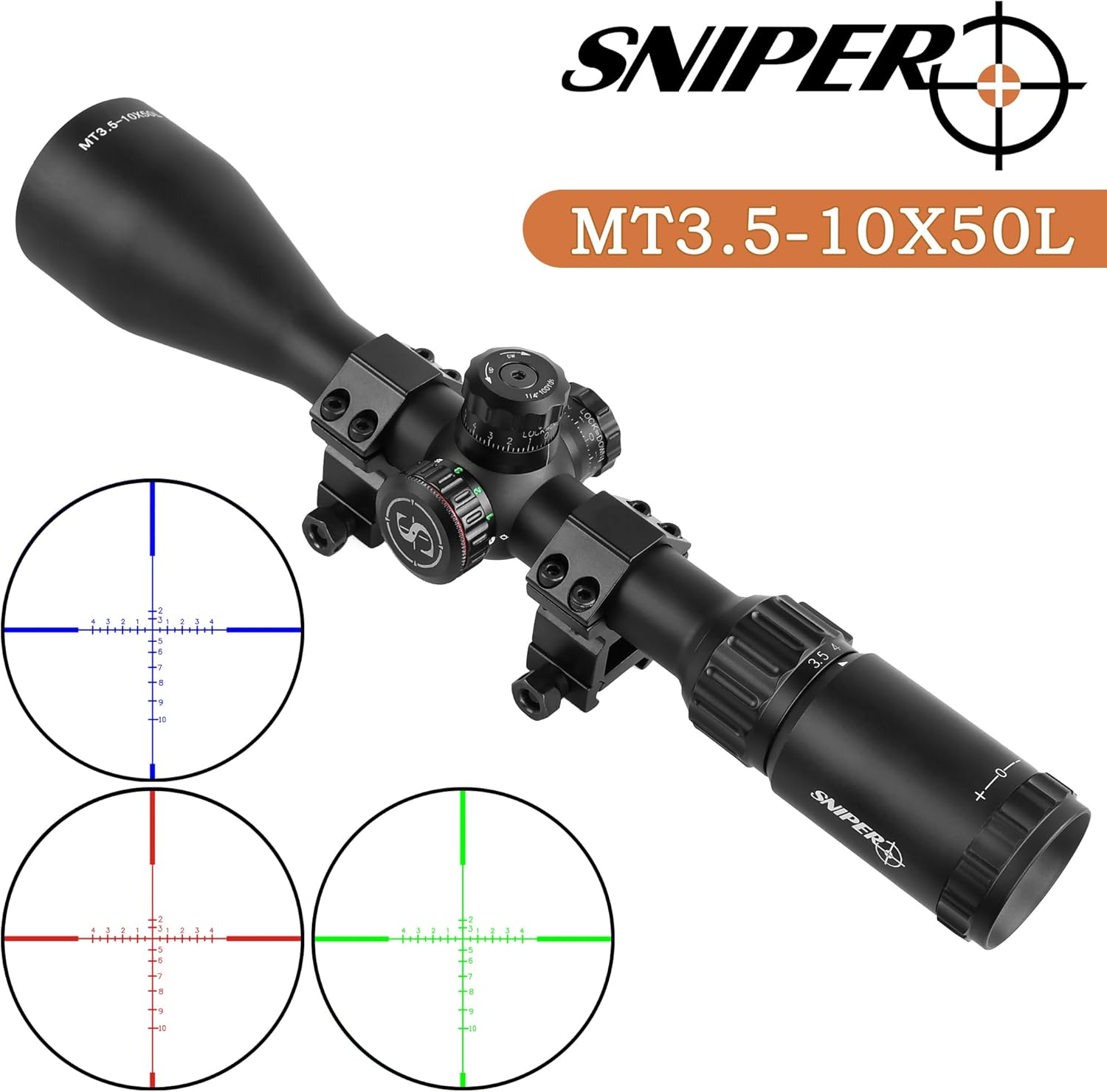 MT3.5-10X50 Riflescope Package includes: 3.5-10×50 scope, flip up lens covers, battery.