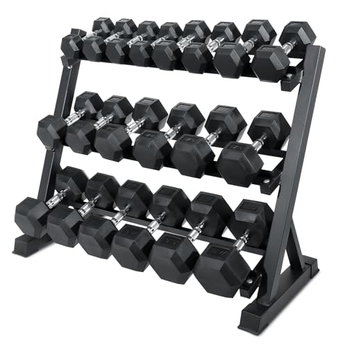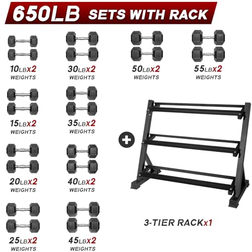 【Package Included】:Contains 2X10LB、2X15LB、2X20LB、2X25LB、2X30LB、2X35LB、2x40LB、2X45LB、2X50LB、2X55LB dumbbells with 1 X 3 Tier Rack. A sturdy set of dumbbells can be used for various barbell exercises, and you can choose different combos to vary the intensity of your workouts.