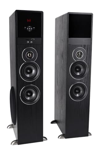Rockville TM80B Complete Powered Home Theater Tower Speaker System With Dual 8″ Subs Built In Bluetooth with 70 foot range and perfect interference-free sound quality Built in USB playback Built in SD card playback Built in FM radio with crystal clear reception (2) 8” subwoofers with incredibly loud and deep bass response (4) Full range drivers: 4” full range drivers with polypropylene cones, rubber surrounds, and bullet dust cap to give you incredible loud and clear sound (2) silk dome tweeters for incredible highs! Peak Power: 800 Watts RMS Power: 200 Watts