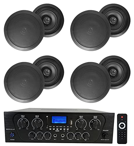 Rockville RPA40BT Bundle: 4-Zone 1000-Watt Peak/250-Watt RMS Bluetooth Home Stereo Receiver, (4) Pairs HC655 6.5″ 500-Watt Peak/160-Watt RMS 8-Ohm in-Ceiling Speakers, Optical and RCA, 5-Items