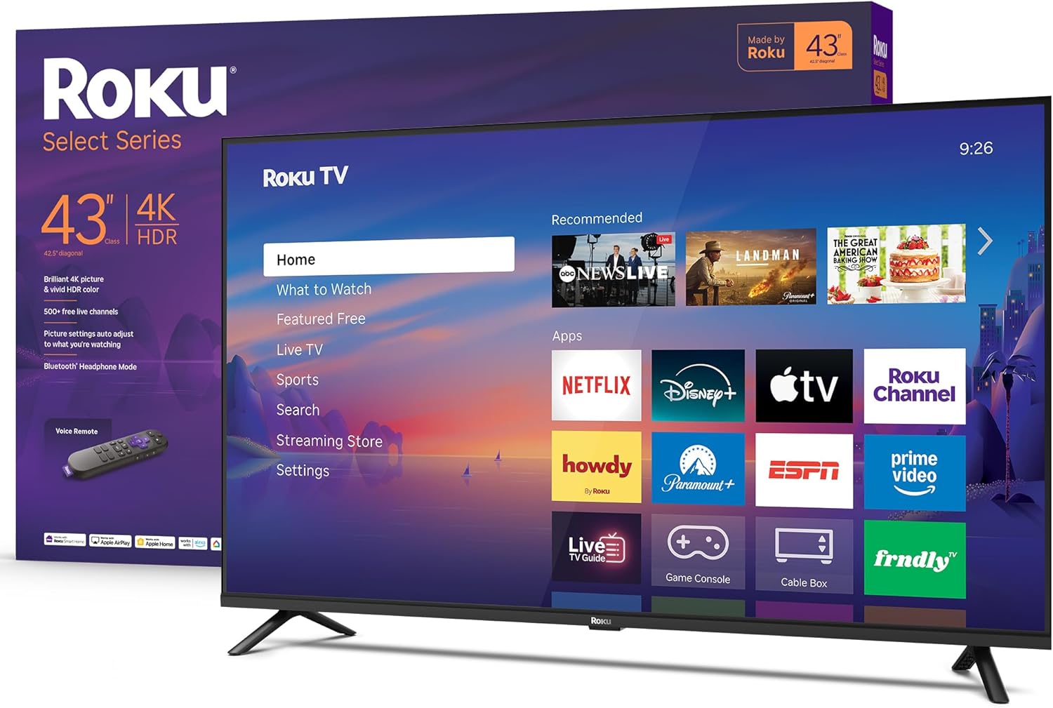 Roku Smart TV 2026 – 43-Inch Select Series, 4K HDR TV – RokuTV with Voice Remote – Flat Screen LED Television with Wi-Fi for Streaming Live Local News, Sports, & Movies – Bluetooth Headphone Mode